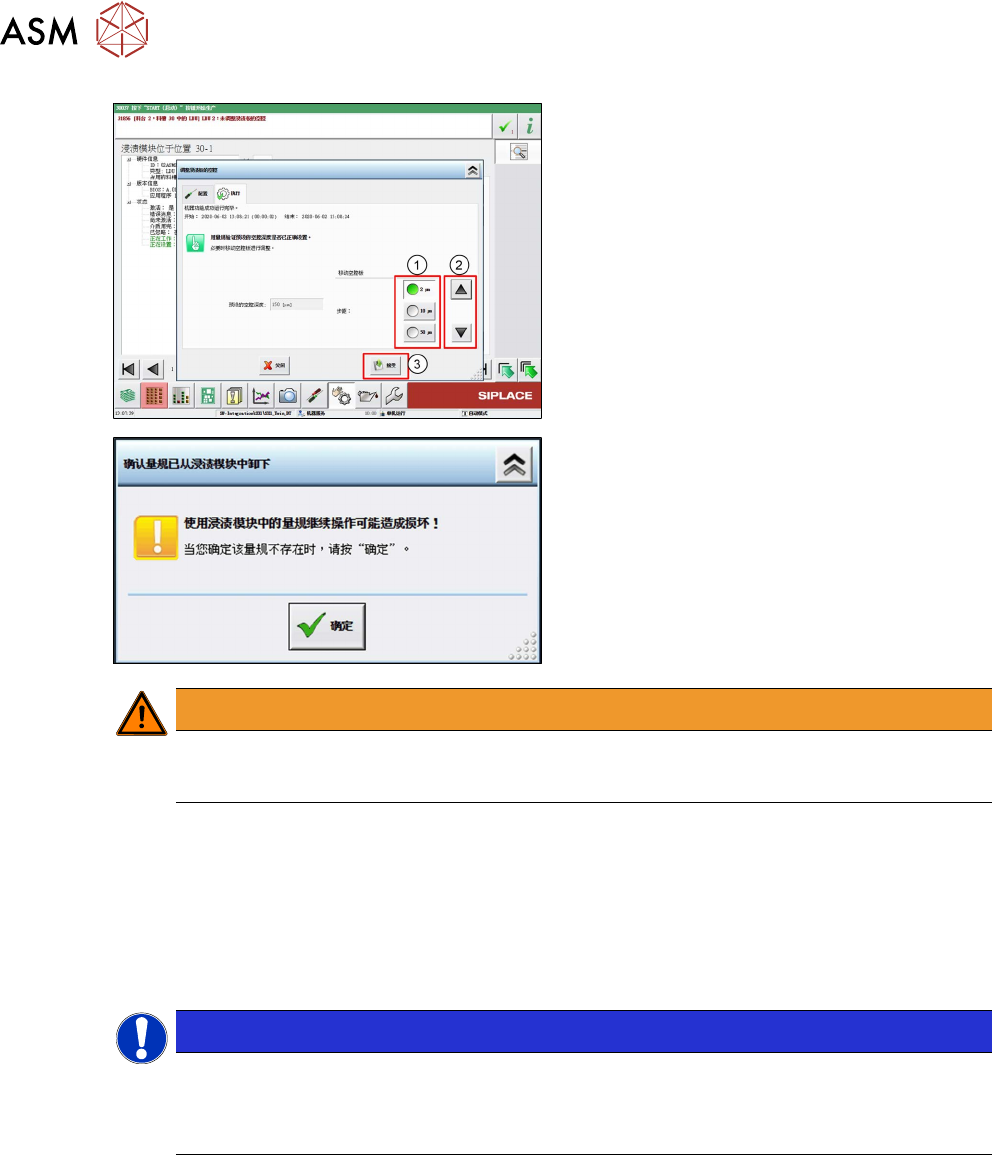4 操作 4.5 检查焊剂层厚度 72 用户手册 SIPLACE Linear Dipping Unit 2 X 05/2020 ► 用该测量仪测量空腔深度。如果测量值与参 考值不相符,可按步骤将自动空腔板示教为 设置值 (50/100/150 µm)。 ► 选择步距 2/10/50 µm (1) 并单击 Upward 或 Downward 按钮 (2) 逐步校正测量值,直到达 到参考值。 ► 单击 Accept 按钮 (3) 可保存自…