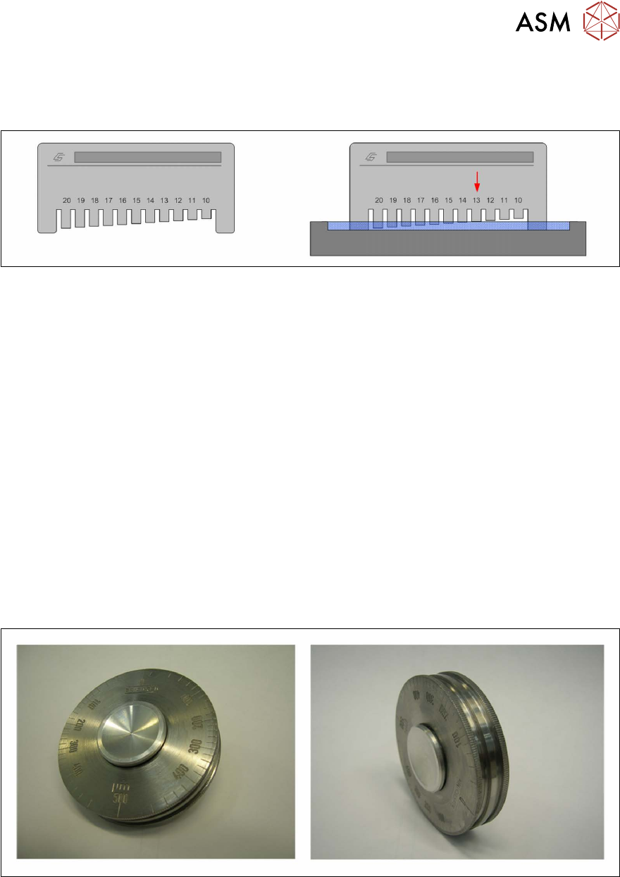测量仪器浸入到焊剂层中。焊剂接触刻齿的点即是焊剂层厚度测量值(右图箭头所示)。