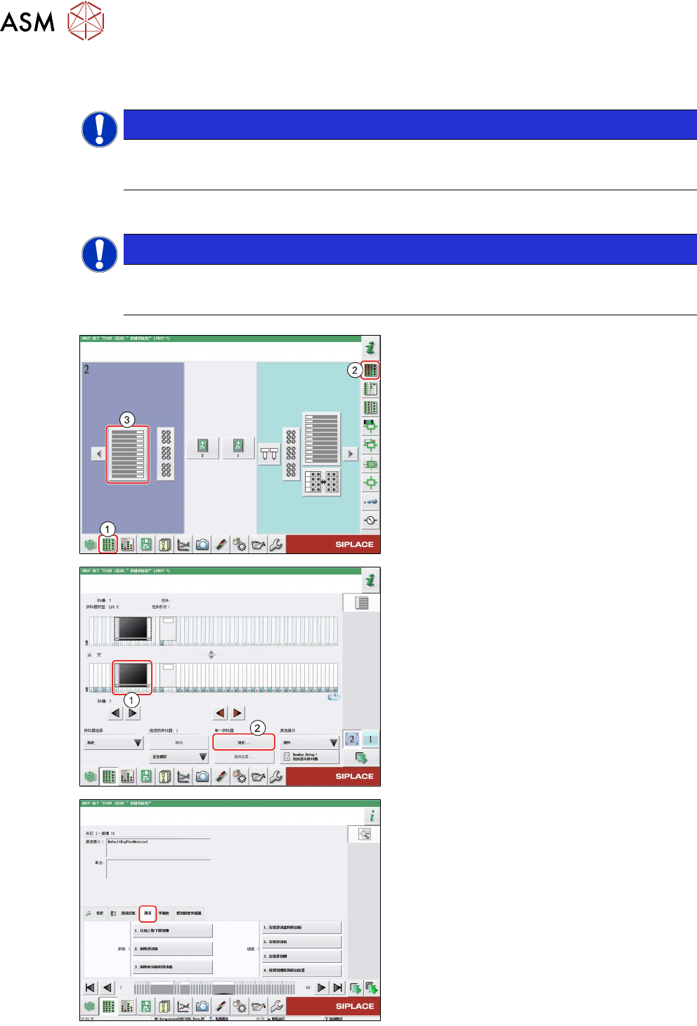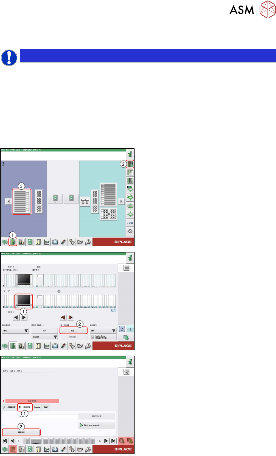 4 操作 4.11 启动回参考点 用户手册 SIPLACE Linear Dipping Unit 2 X 05/2020 83 4.11 启动回参考点 提示 目标组:标准操作员 所述操作是一项需要定期执行的任务,仅可由经过培训的操作员执行。 登录后,必须执行回参考点,方可设置和使用 LDU。在回参考点期间,轴被初始化。在此过程中, 轴的末端位置被确定并移动到确定的位置。 要求: ● 刮刀必须安放在挡板上方后固定挡块处。 ► 如果需要,…