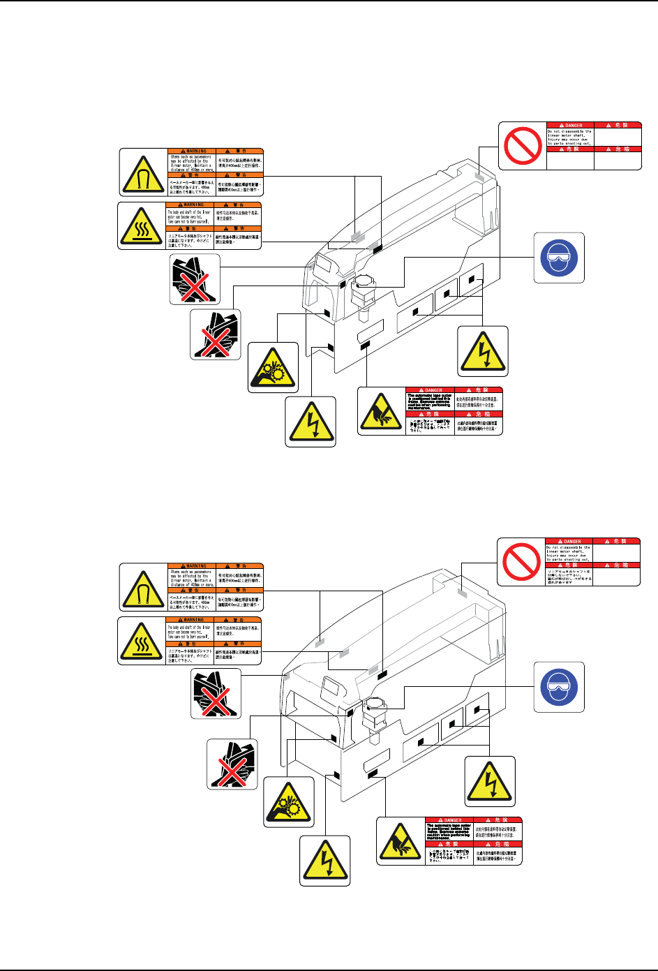 表示使用机器时的注意事项的安全标识贴在机器的下图所示位置。请仔细阅读记载内容,安