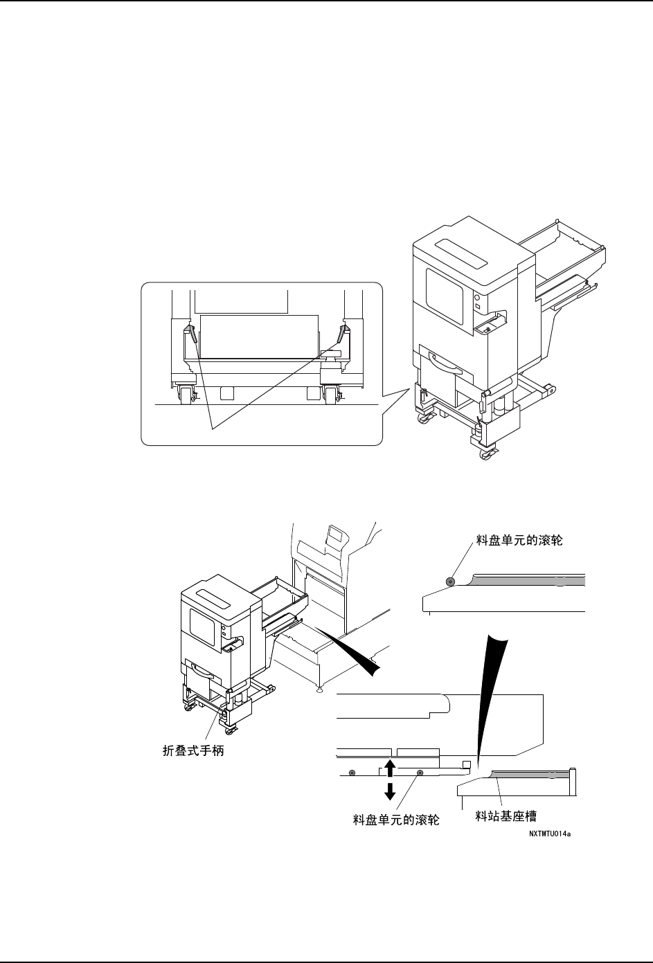 2. 旋转折叠式手柄,使料盘单元 -L 的滚轮与模组端料站基座槽的大致高度相一致。此时,