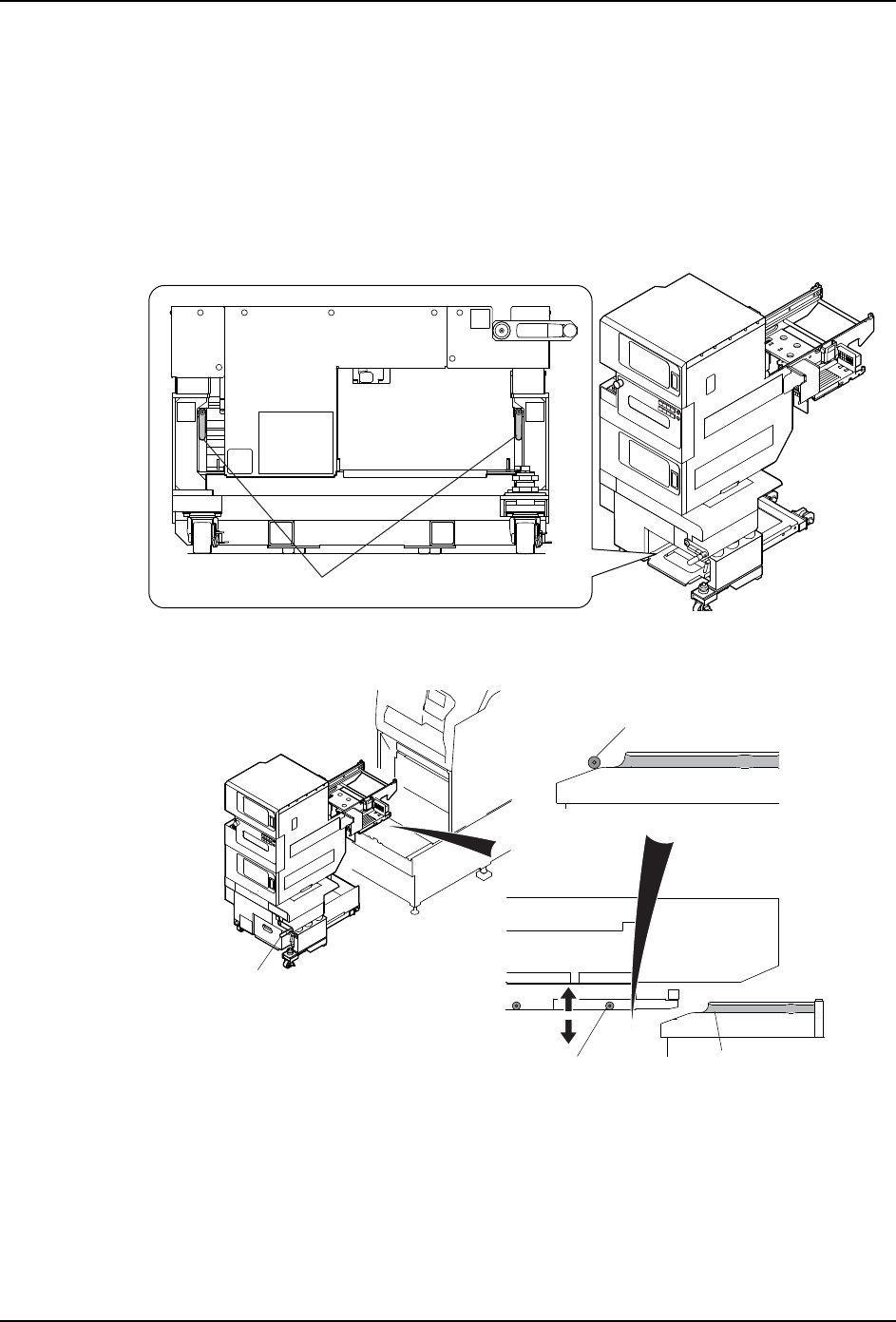 该作业需要使用水平仪 (2 个)。首先,在从机器本体上拆下了料盘单元 -LT 的状态下,预