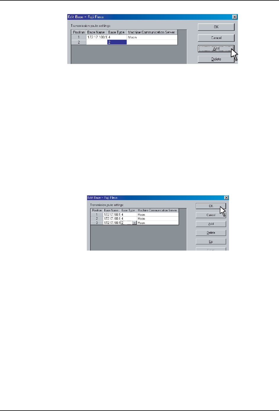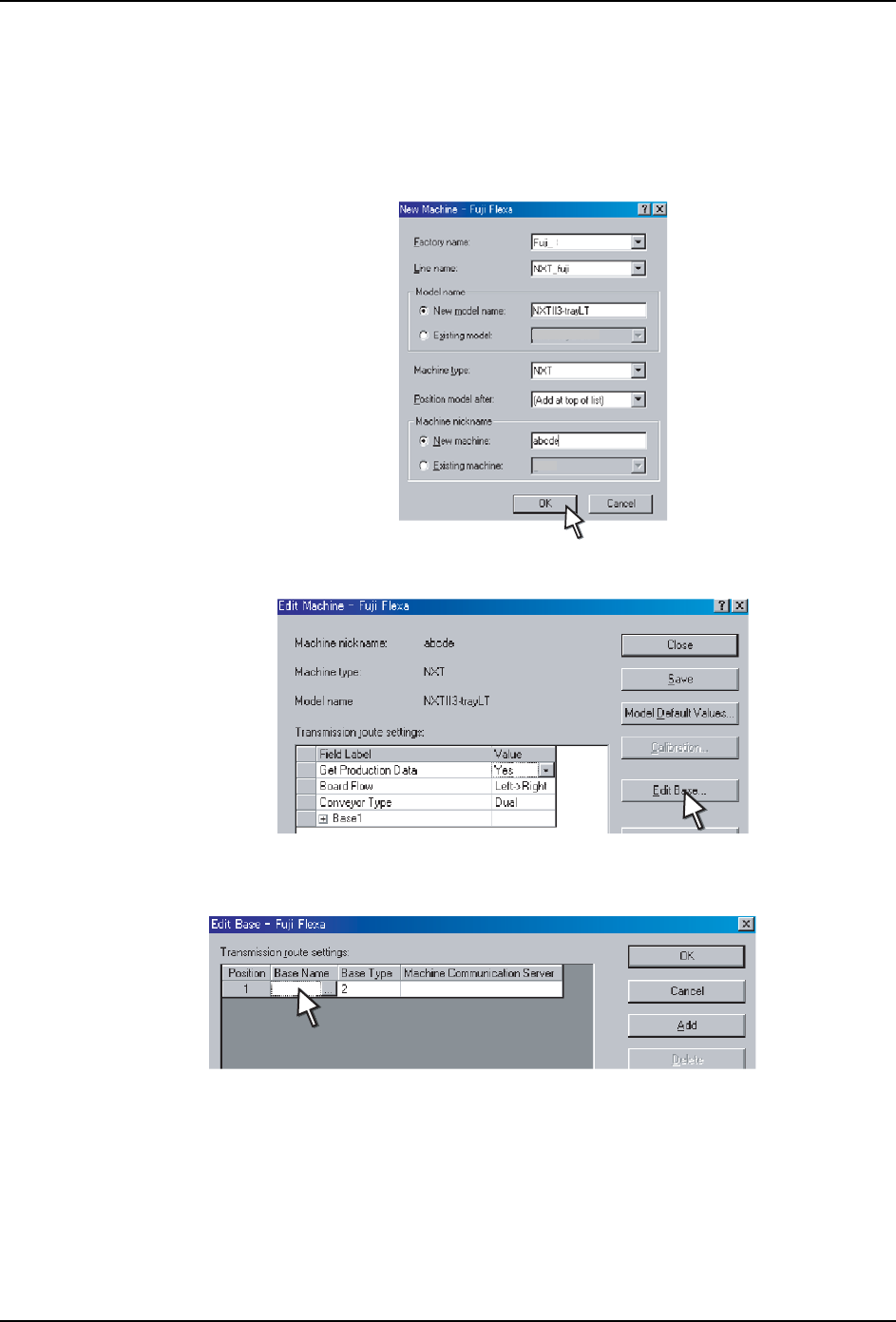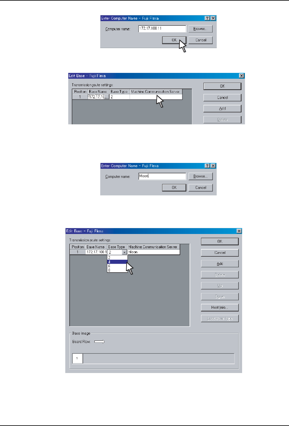 4. Fuji Flexa 生产线构成的设定 QD139-11 76 NXT II 安装手册 11.双击 [ 机器通信服务器 ] 的数据 字段。 12.显示出 [ 输入计算机名 ] 对话框。请 输入安装了用于和机器进行通信的通信服务器的计 算机的 IP 地址或者网络名称,点击 [OK]。 备注 )点击 [ 浏览 ] 可对基座的网络设定进行浏览。 13.双击 [ 基座类型 ] 的数据字段, 从下拉菜单中选 择基座类型。[ 基座图像 ] 组…