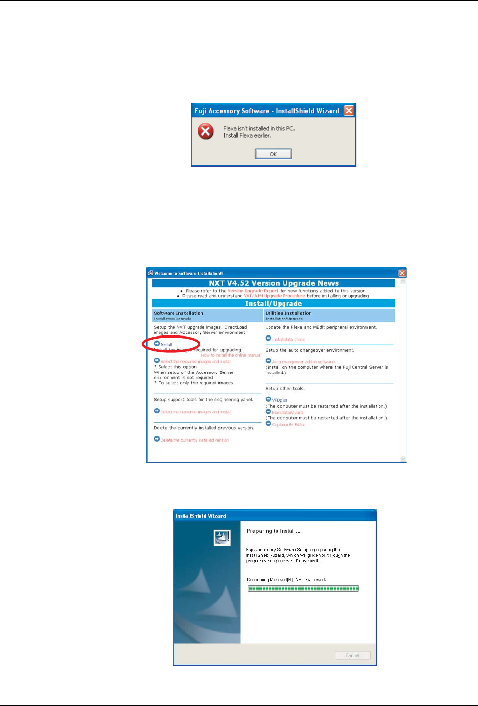 QD139-11 5. 安装 Fuji 附加软件 NXT II 安装手册 87 5.4 Fuji 附件软件服务器的安装 注意事项 : 对要安装 Fu ji 附件软件 的 PC, 请确认已经 安装了 Fuj i Flexa。 如果在没有安 装 Fuji Flexa 的 PC 要安装 Fuji 附件软件的话,显示出以下画面。 5.4.1 安装方法 1. 将 NXT 软 件 CD-ROM(Disk1) 插入到 CD 驱动器中 。在启动画面显示…