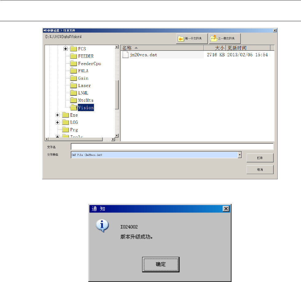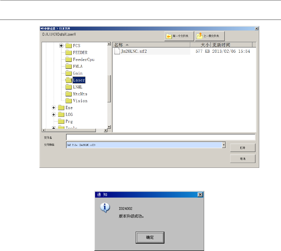 MS 参数 6-3 6- 2 版本升级 - LNC 120 进行 LNC 120 固件的版本升级。 6-2- 1 操作 选择 “ 版本升级 ” - “ 版本升级 - LNC 120” 后,会显示以下 的对话框。 按 “ 执行 ” 按钮,打开 用于进行版 本升级的对话框 。 (默认 位置 : D:\JUKI\ DATA \Laser ) 选择文件( Jm20LNC.nf2 ),按 “ 打开 ” 按钮读入文件,对 所有全 LNC 120 的…