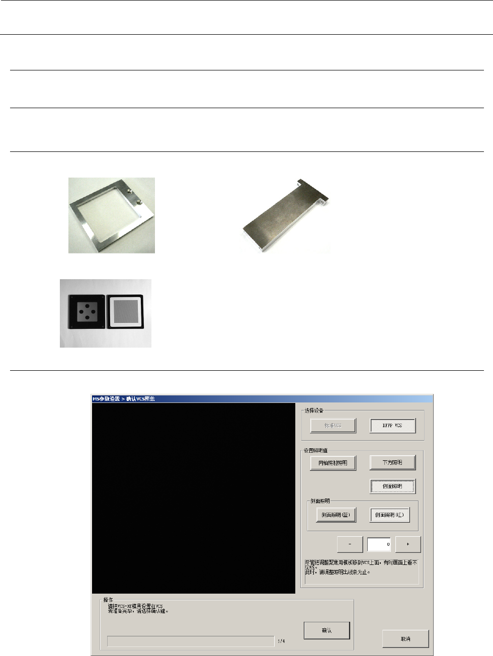 MS 参数 7-4 在「选择设备」中,只 能选择 DFFP VCS 。 「照明值设置」项目中 的同轴落射 照明、下方照明 及侧向照明的光量如下 表所示状态。。 照明种类 光量值 同轴照射照明 0 下方照明 200 侧面照明(蓝) 0 侧面照明(红) 0 ※初始值的设置如上所述 。 <操作⑫ 1/4 > 请在 VCS 上安装 V CS -HT 工具。完成准备后,请按 下确认。 <操作⑫ 2/4 > 请在 VCS- HT 工具上安装对焦调整…