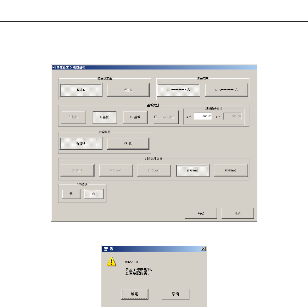 ※ 改变传送规格后如按“确定”,会显示装置组装位置变更的信息,进行MS参数和机器设置