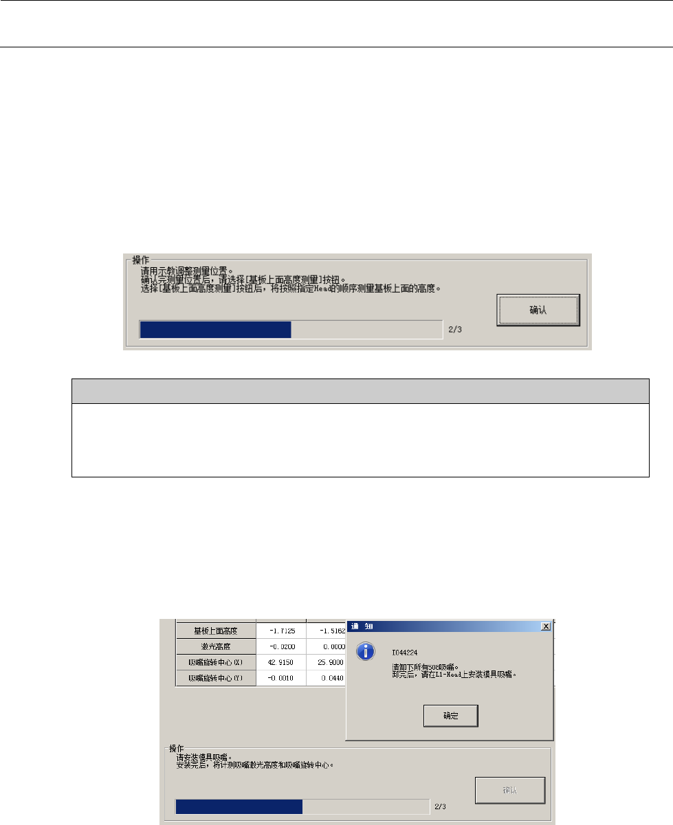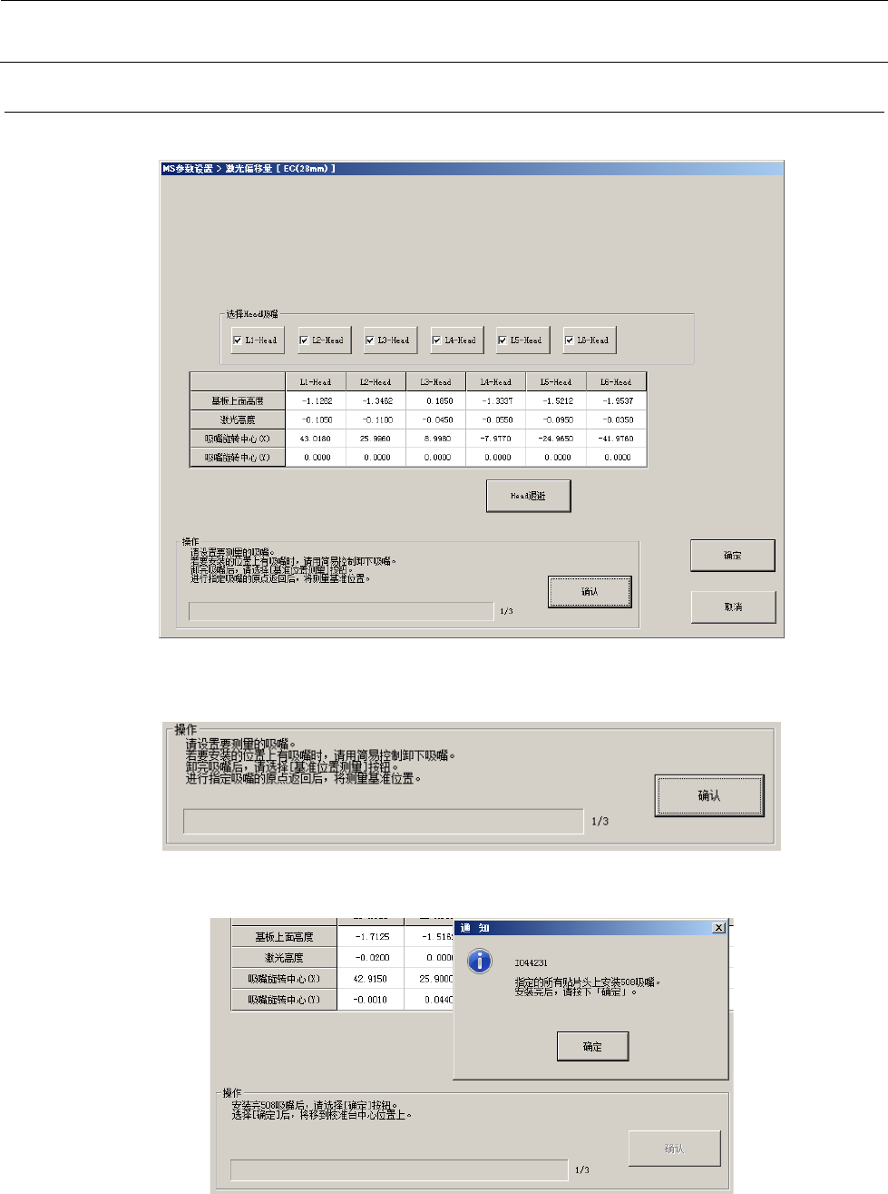 MS 参数 4- 10 4-4- 3 操作 选择 “ 偏移量设置( O ) ”—“ 激光偏移 量( L ) ” 后,会显示设 置激光偏移量的对 话框。 <操作 ・ 1/3 > 如果要测量的 Head 装有 吸嘴,卸下 吸嘴。 如选择 “ 确认 ” ,即进 行吸嘴套 高度 的 检测。