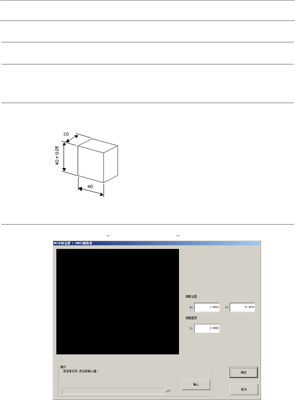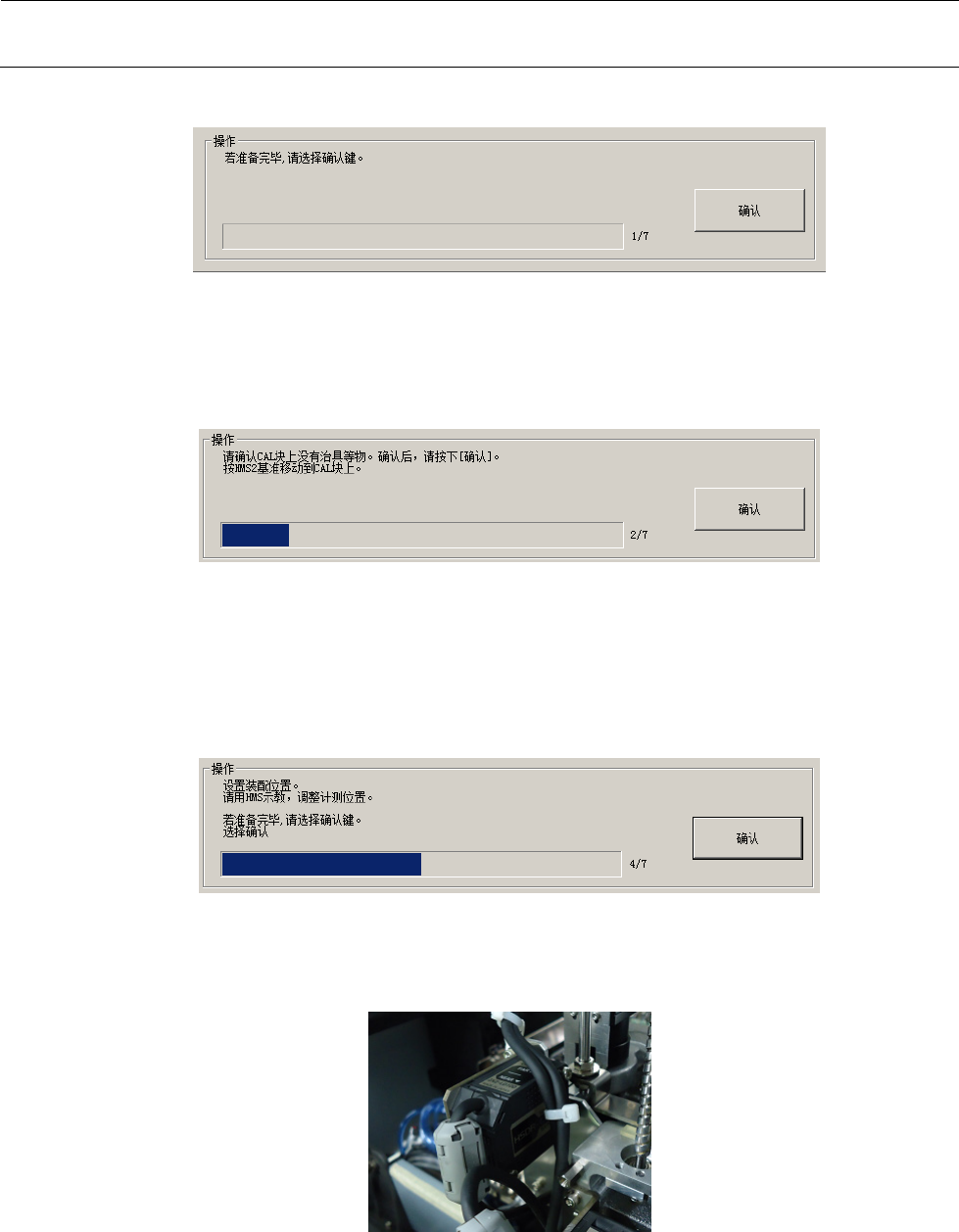 MS 参数 4- 30 <操作⑫ 1/5 > 按下 “ 操作 ” 框内的 “ 确认 ” 按钮。 按下后,为了确认校准 台上没有 夹具 之类,进行 Head 退避。 <操作⑫ 2/5 > 请确认校准台上没有 夹具 之类。 确认完毕后,按下 “ 确认 ” 按钮。 “ 确认 ” 按钮被选择后 , HMS 向校准 台第 1 标记 位置 移去。 <操作⑫ 3/5 > 请利用 HMS 示教 逐步 移动 Head ,使传 感器光与校准 台的第 1 标…
