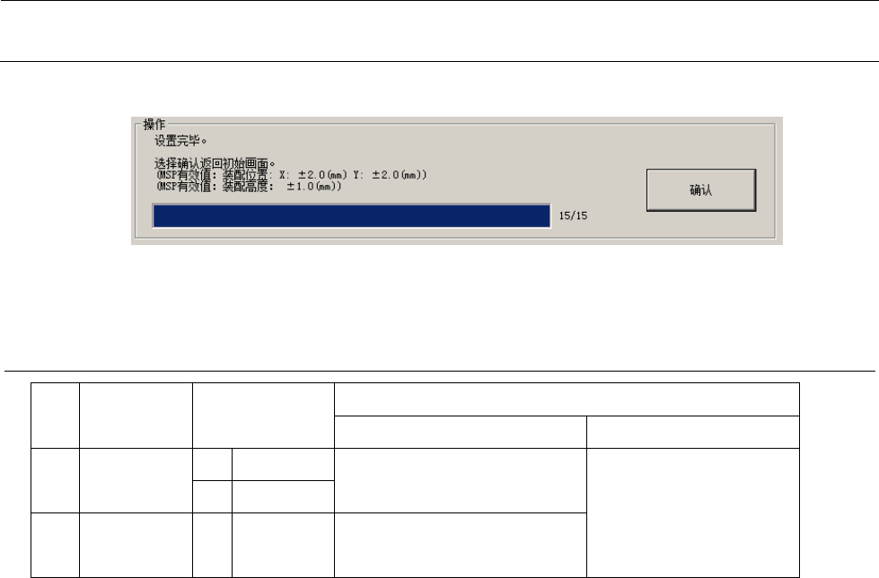 MS 参数 4- 44 < 操作 ⑫ 15/15 > 按下 “ 确认 ” 后,会显示设置结束 的对话框。如 按 “ 确认 ” ,返回 初始 画面 。 4- 14 - 4 MSP 容许值 No. 项目 MSP 容许值 MSP 值不良时 出现的问题 检测(更换)项目 1 装配 位置 X ±2.0mm 卡盘 吸嘴更换故障 、 同时更 换吸嘴的动作不 启动 ATC 装置的装配精 度 Y ±2.0mm 2 装配 高度 Z 1.0 ± 1.0m m…