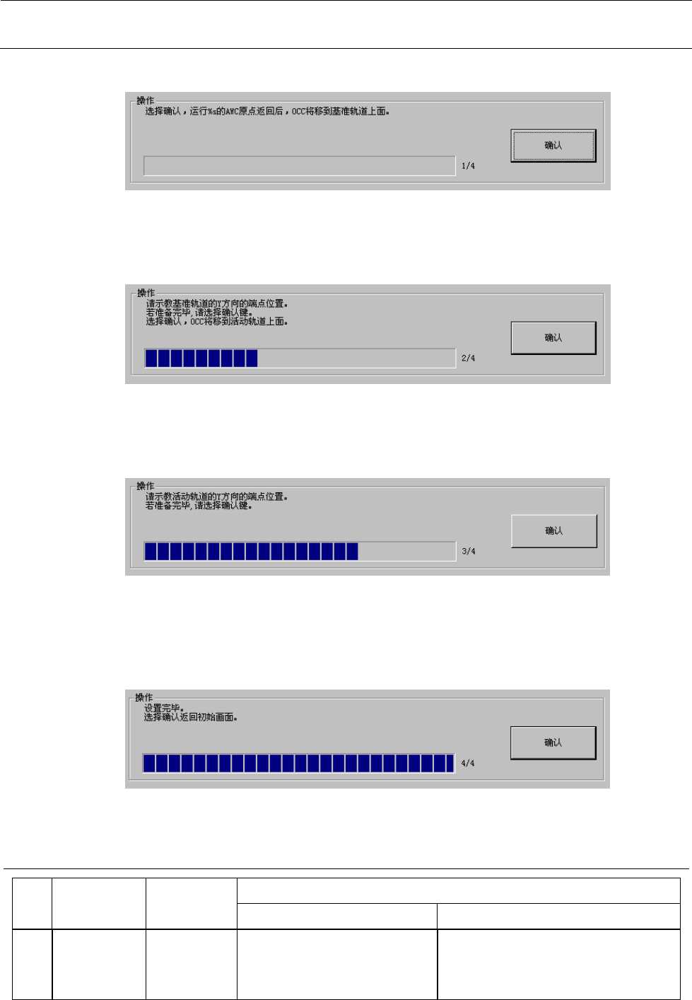 MS 参数 4- 46 <操作⑫ 1/4 > 请选择 “ 操作 ” 框内的 “ 确认 ” 按钮 。 “确认”按钮被按下 ,则 AWC 原点返 回完成后 OCC 将移动到基准轨道 上。 <操作⑫ 2/4 > 请利用示教决定基准轨 道内侧的 Y 坐标 。 示教结束后,请按下 “ 确认 ” 按钮。 如按下 “ 确认 ” 按钮, OC C 将移动到活动轨道上 。 <操作⑫ 3/4 > 与基准轨道相同,请利 用示教决定 活动轨道内侧的 Y 坐标。…