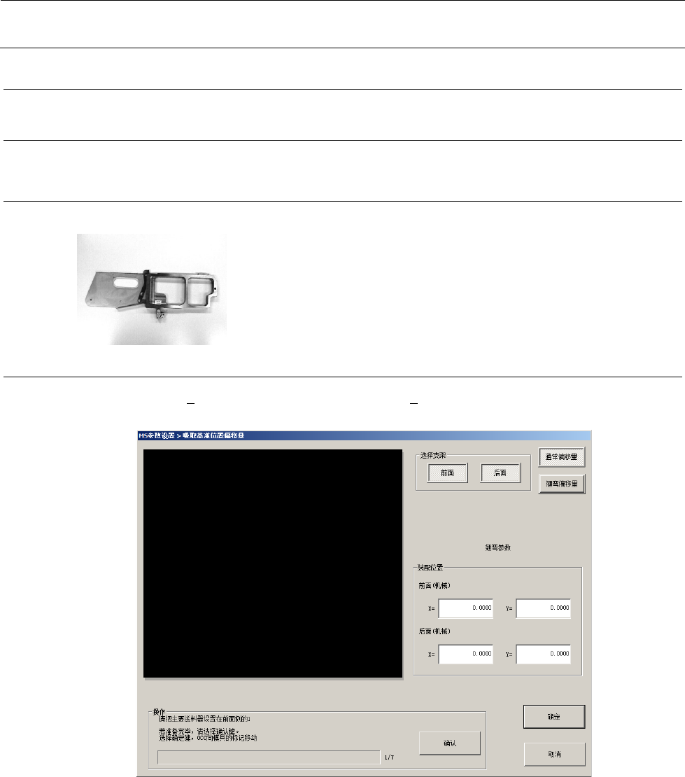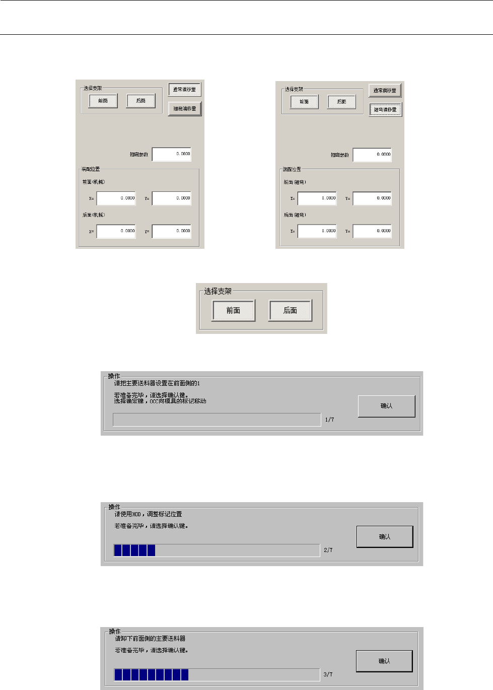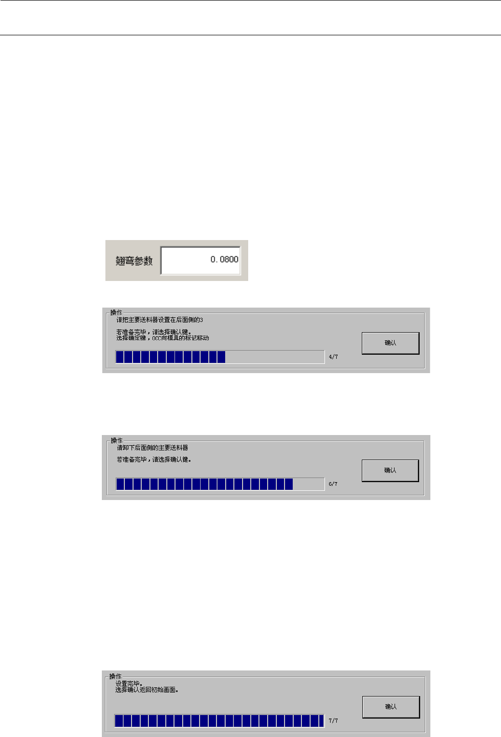 MS 参数 4- 48 ※ 对通常偏移量、翘弯偏 移量的按钮 进行切换,就可 以切换偏移量值的显示 。 ⑫选择“通常偏移量” 时 ⑫选择“翘弯偏移量” 时 请在以下的台架选择中 选择要取得 的台架。 <操作⑫ 1/6 > 进行台架选择后,请将 主送料器安 装在操作说明中 指示的 位置 。 准备好后,请按 “ 确认 ” 按钮。进行校准台标记 的识别后,以 OCC 基 准移动到 夹具的标 记上。 <操作⑫ 2/6 > 请利用摄像机示教进行 …