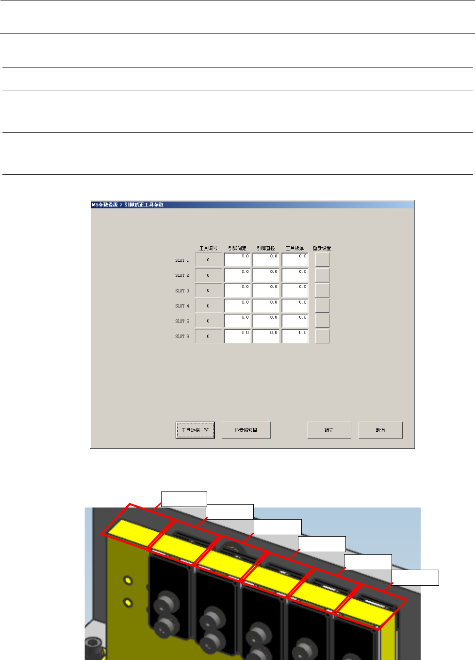 MS 参数 4- 60 4- 21 引脚矫正工具 参数 4- 21 - 1 功能 设置 安装到 引脚矫正 工具 单元的 工具 参数。 4- 21 - 2 使用夹具 本设置 下不 使用夹具。 4- 21 - 3 操作 选择 [ 偏差设置 (O) ][ 引脚矫正工具 参数 ( J ) ...] ,则 显示 引脚矫正 工具 参数的设置 画面 。 如下图所示, 工具 S LOT 的 编号是按照从工 具单元左侧 开始的顺序分配 。 请设置安装了 …
