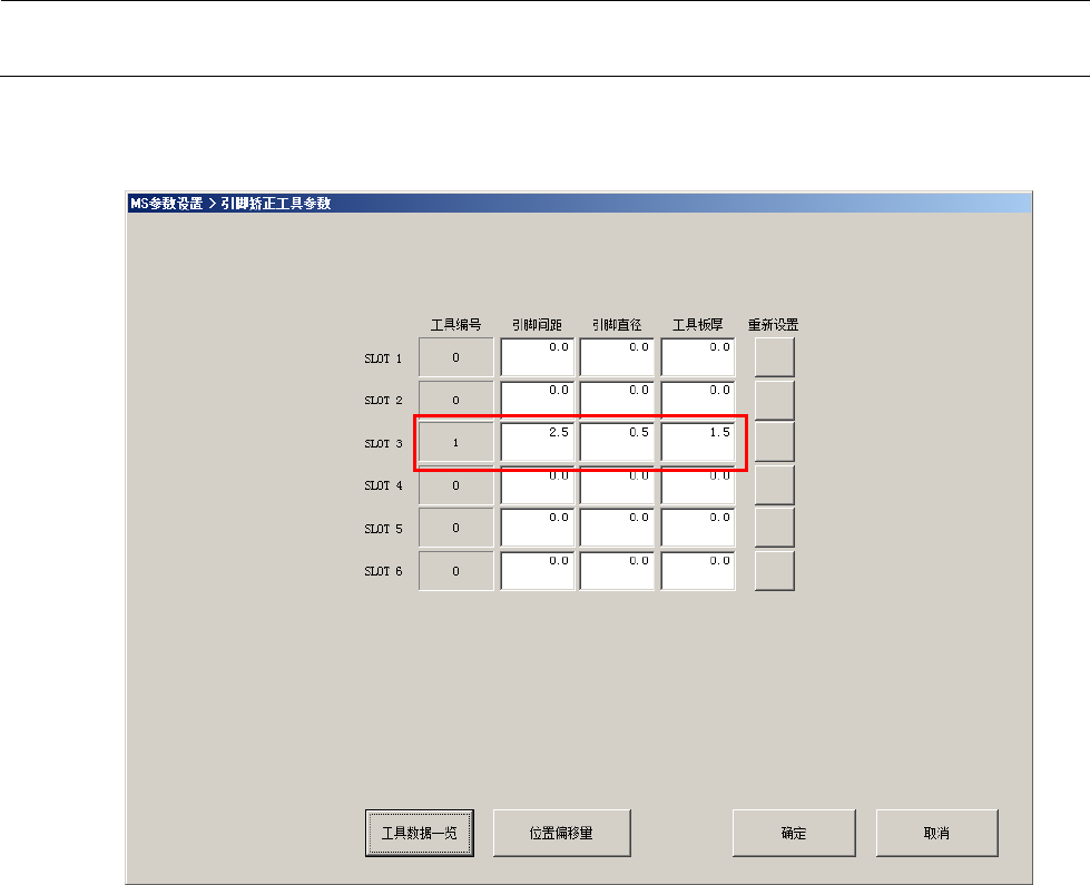 选择 [偏移量设置(O)][引脚矫正工具参数(J)...] [工具位置偏移量] ,显示出引脚矫正工具