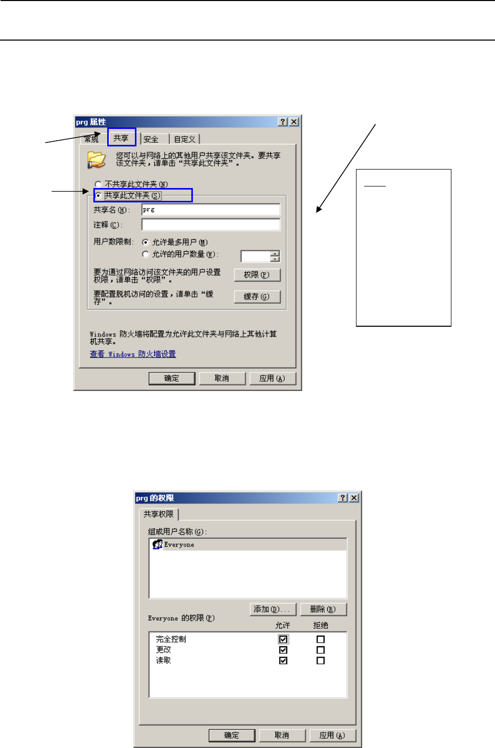 7) 请勾选“共享此文件夹”。并且,请确认“共享名”为“Prg”。当共享名不是“Prg”时,请修改