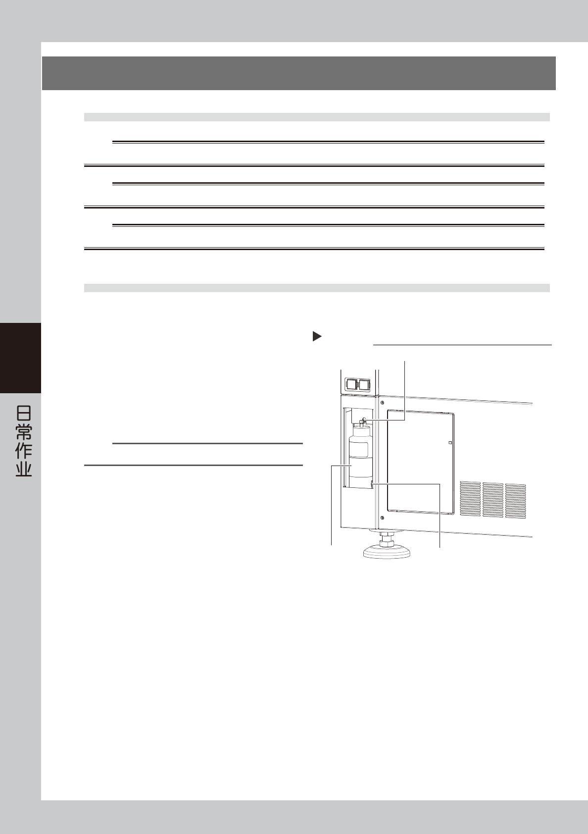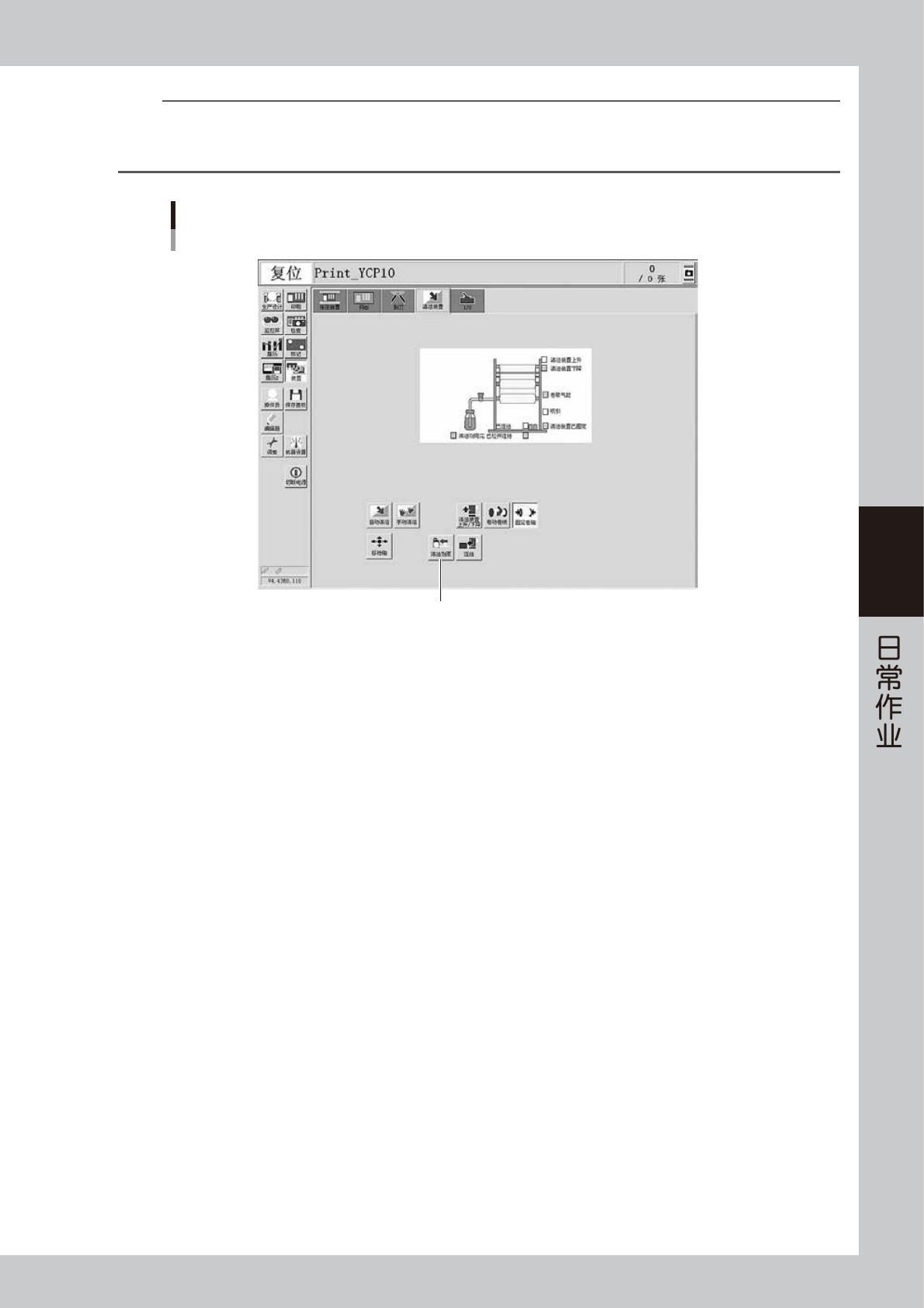 4-13 4 n 要点 初次安装清洁剂瓶或长时间未使用清洁剂时,在安装了清洁剂瓶之后,请务必按照下列步骤检查清洁剂是否可以喷到卷纸上。 1. 从“装置”画面选择“清洁装置”选项卡。 2. 按 [ 清洁剂泵 ] 按钮,喷出清洁剂,直到卷纸上开始浸入清洁剂即可。 装置画面 “清洁装置”选项卡 [清洁剂泵]按钮 66407-N1-00