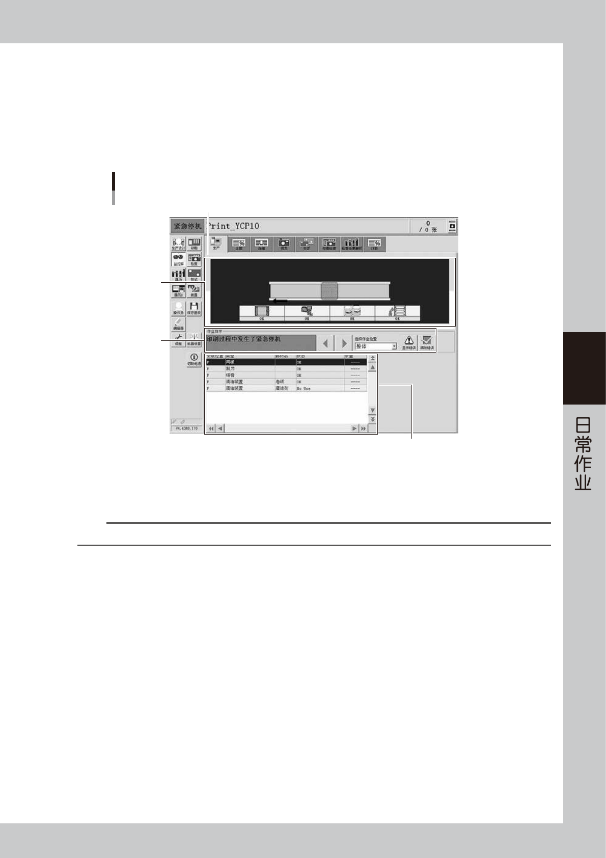 本画面,以机器配置图的形式显示当前正在生产的印刷机的实时信息。印刷机出错时,打开该画面,即可确认发
