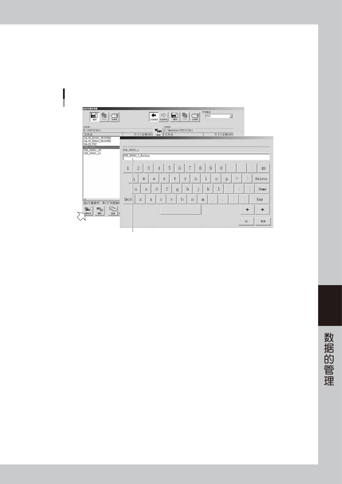6-5 6 0 根据需要更改文件名。 为了区分原基板程序与复制后的基板程序,可以更改复制后的基板程序文件名。 1. 选择复制后的文件。 2. 按左下方的 [ 重命名 ] 按钮后,显示键盘对话框。 3. 输入新的基板名之后,按 [OK] 按钮。 输入新的基板名 重命名 66606-N1-00