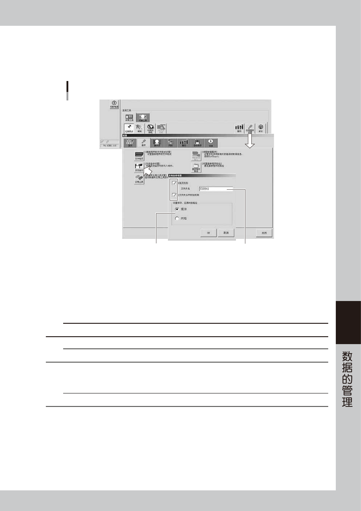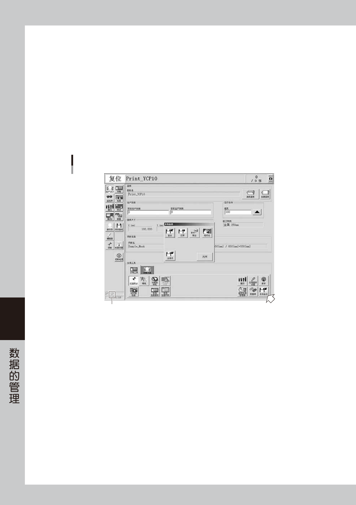 6-8 6 1.2.2 备份的方法 此处,以备份至 USB 存储器为例,介绍备份系统数据的方法。 1 将 USB 存储器插入 USB 端口中。 将 USB 存储器插入印刷机的 USB 端口中。 2 确认 USB 存储器已连接。 确认操作画面左下方的显示窗。 USB 存储器的图标显示为红色时,表示已完成连接。 USB 存储器的图标显示为灰色时,表示没有完成连接,需重新连接。 3 打开系统备份画面。 按“生产设计”画面“实用工具”分组框内的…