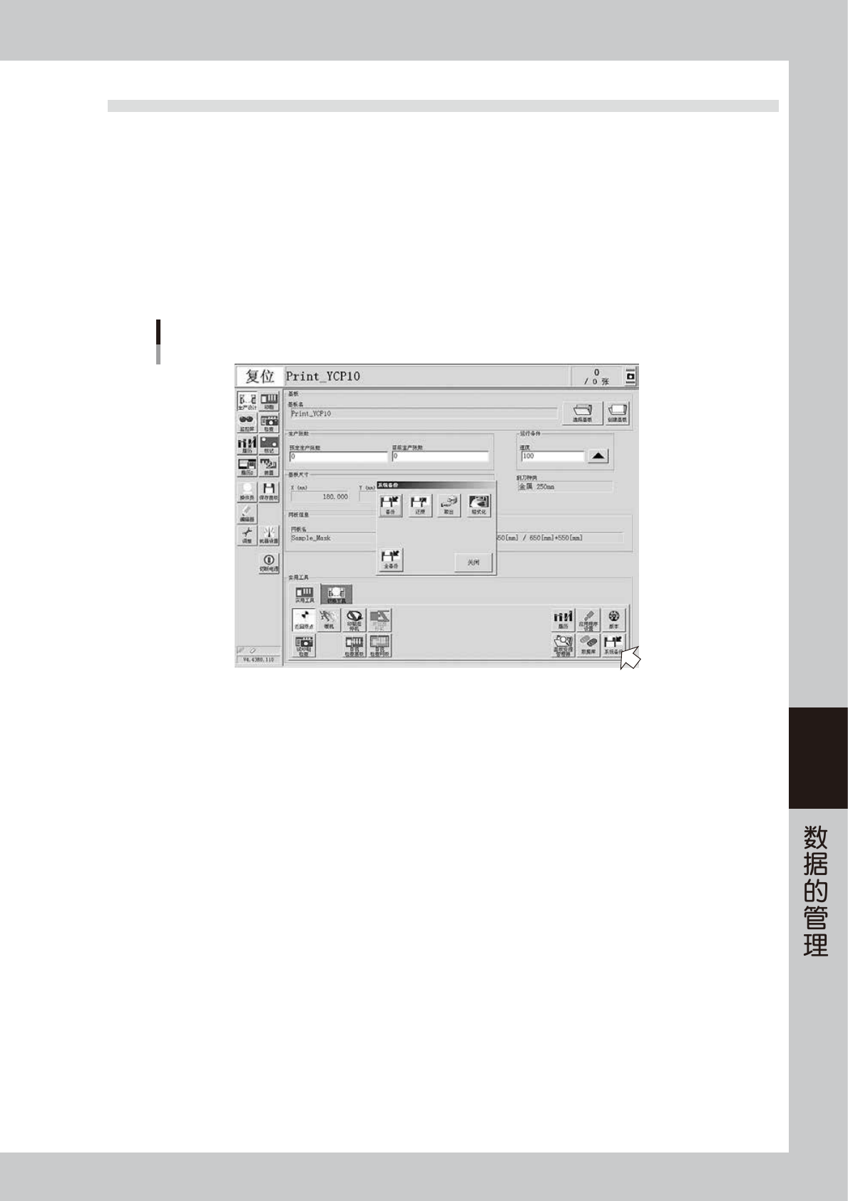 按“生产设计”画面的 [ 系统备份 ] 按钮。