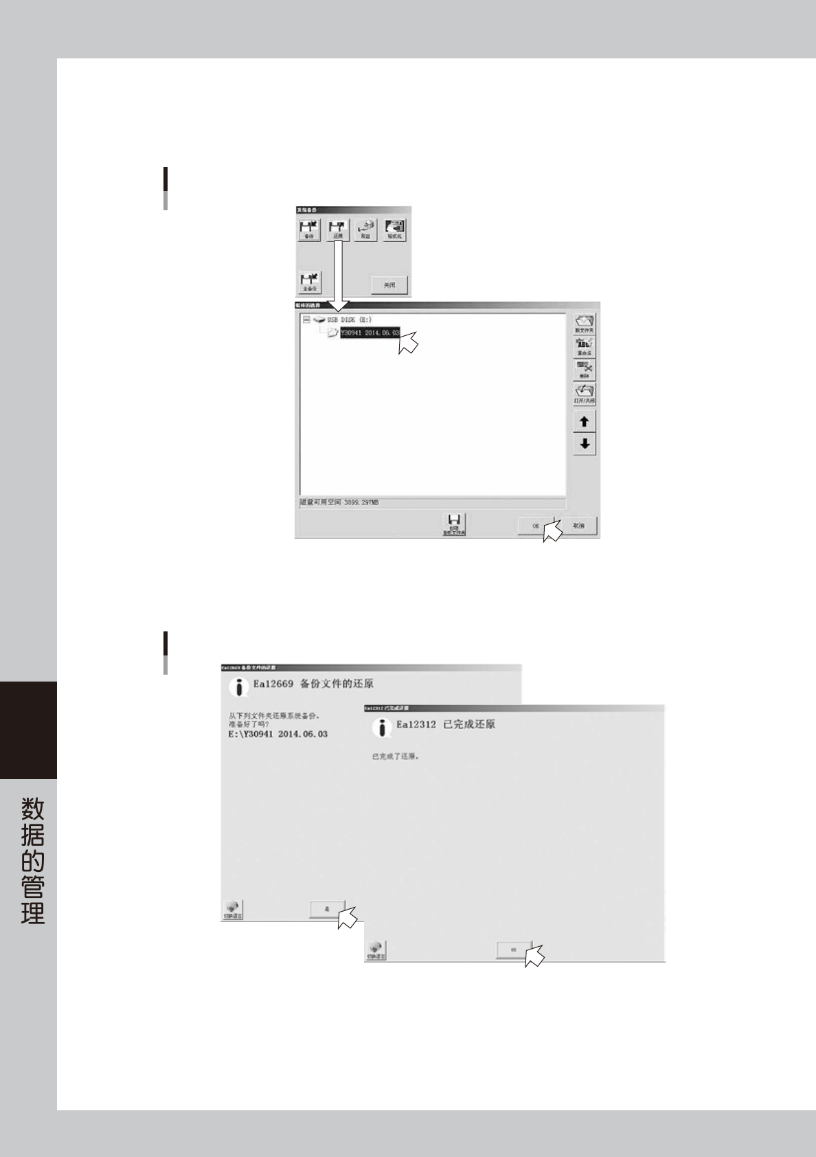 1. 将装有系统备份数据的 USB 存储器插入 USB 端口中,按“系统备份”画面的 [ 还原 ] 按钮。