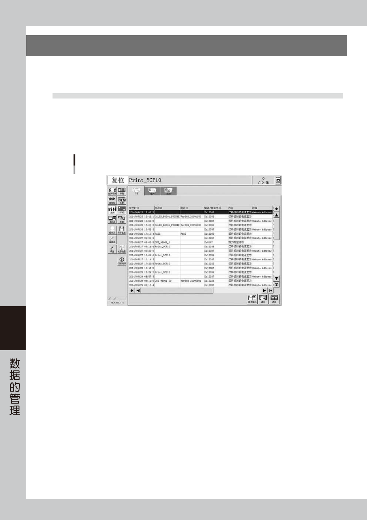 6-18 6 3. 履历管理 本印刷机可以收集、保存、显示自动运行中的各种生产信息与发生的错误等履历数据。除了收集日常生产信息与 生产履历,还支持利用网络自动收集履历的“履历自动收集系统” 。 3.1 关于履历 本印刷机可以管理机器的生产履历、运行履历与使用状况。 履历,分为日志形式的“履历”与对数据进行计数的“履历 2”两种。 3.1.1 履历 按 [ 履历 ] 按钮,打开履历画面。 “履历”画面中有“日志” 、 “生产” 、 …