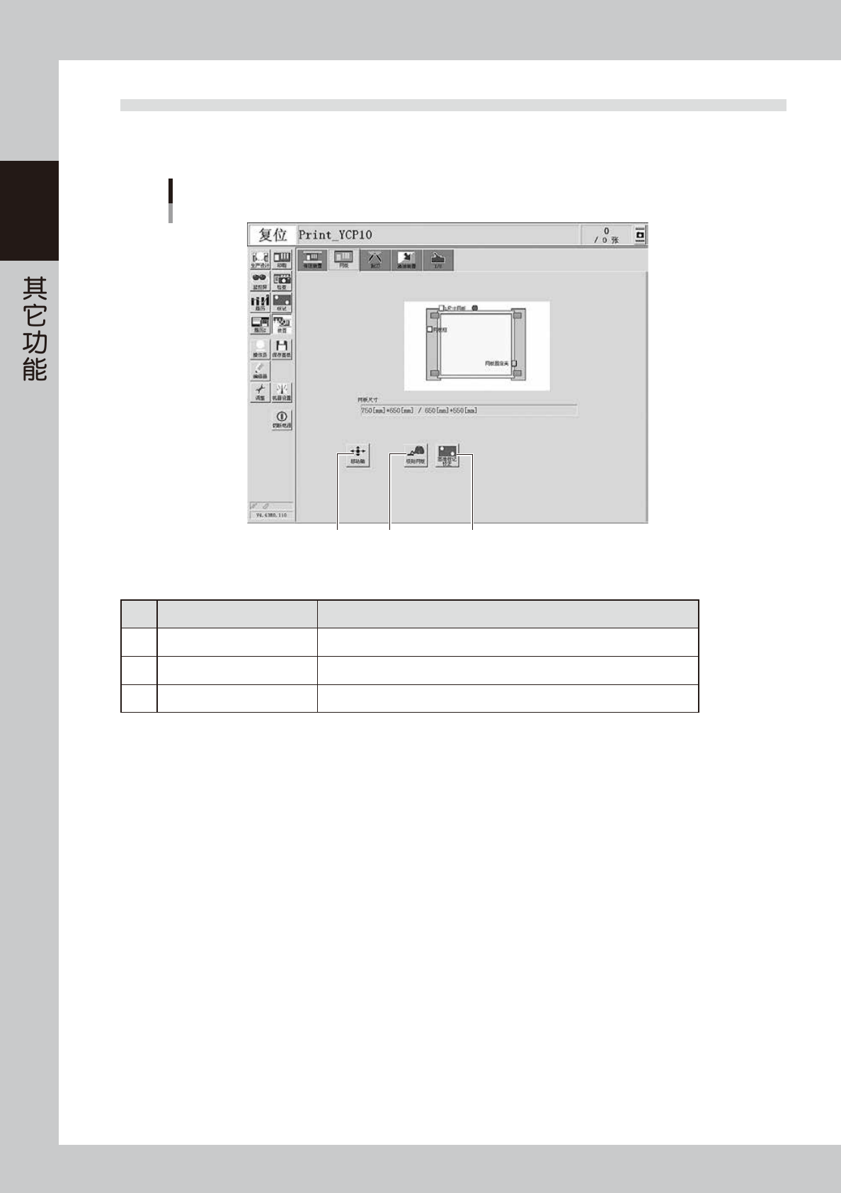 7-20 7 4.3 [ 装置 ] -“网板”画面 在 [ 装置 ] -“网板”画面,可以手动操作 [ 吸附网板 ],还可以在示意图上确认网板传感器的状态。 下面,介绍各按钮的功能。 [装置] -“网板”画面 3 1 2 66720-N1-00 ■ 操作按钮 按钮名 功能 1 [ 移动轴 ] 按钮 打开“移动轴”画面 ( 参阅本章前述“4.1 ‘移动轴’画面”)。 2 [ 吸附网板 ] 按钮 开、关网板吸附装置。 3 [ 基准标记校正…