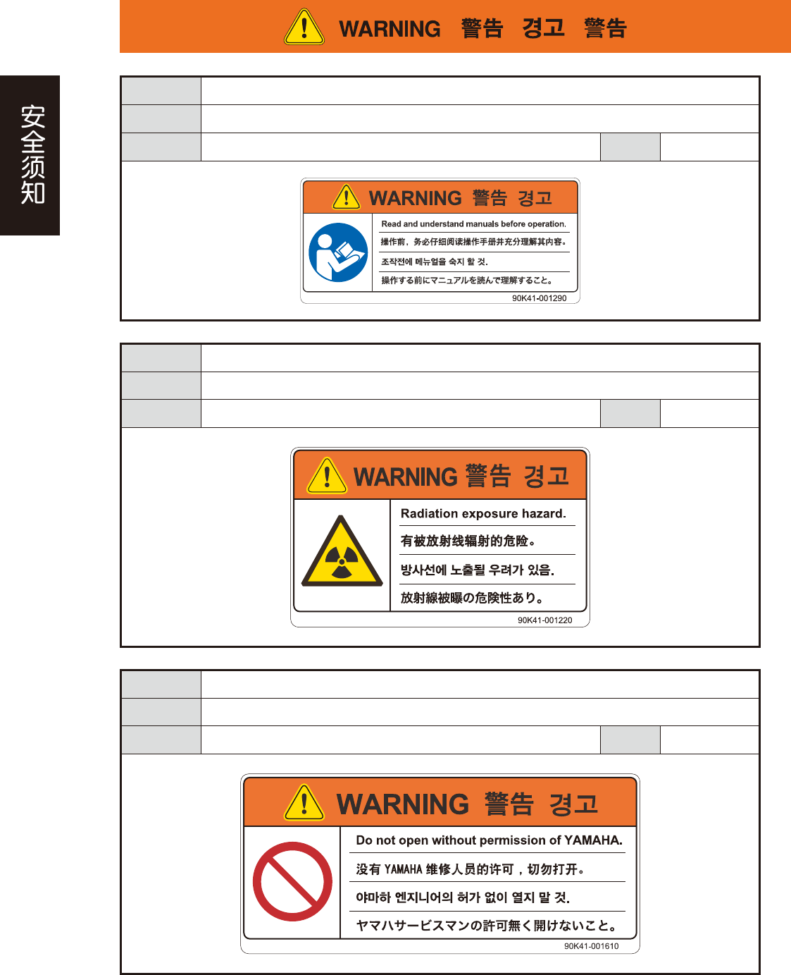 xx 危险结果 有使设备受损或身体受伤的危险。 安全防范 操作设备 ( 装置 ) 之前,务必仔细阅读操作手册并充分理解其内容。 对象 Z:LEX(YSM20/YSM20W)、YSM40/YSM40R、YS 系列所有机型 警告阶段 所有作业 危险结果 有被放射线辐射的危险。 安全防范 务必关闭安全盖再运行。 对象 YSi-X 警告阶段 所有作业 危险结果 有受伤的危险。 安全防范 不经 YAMAHA 维修人员的许可,请勿打开。 对象 与直…