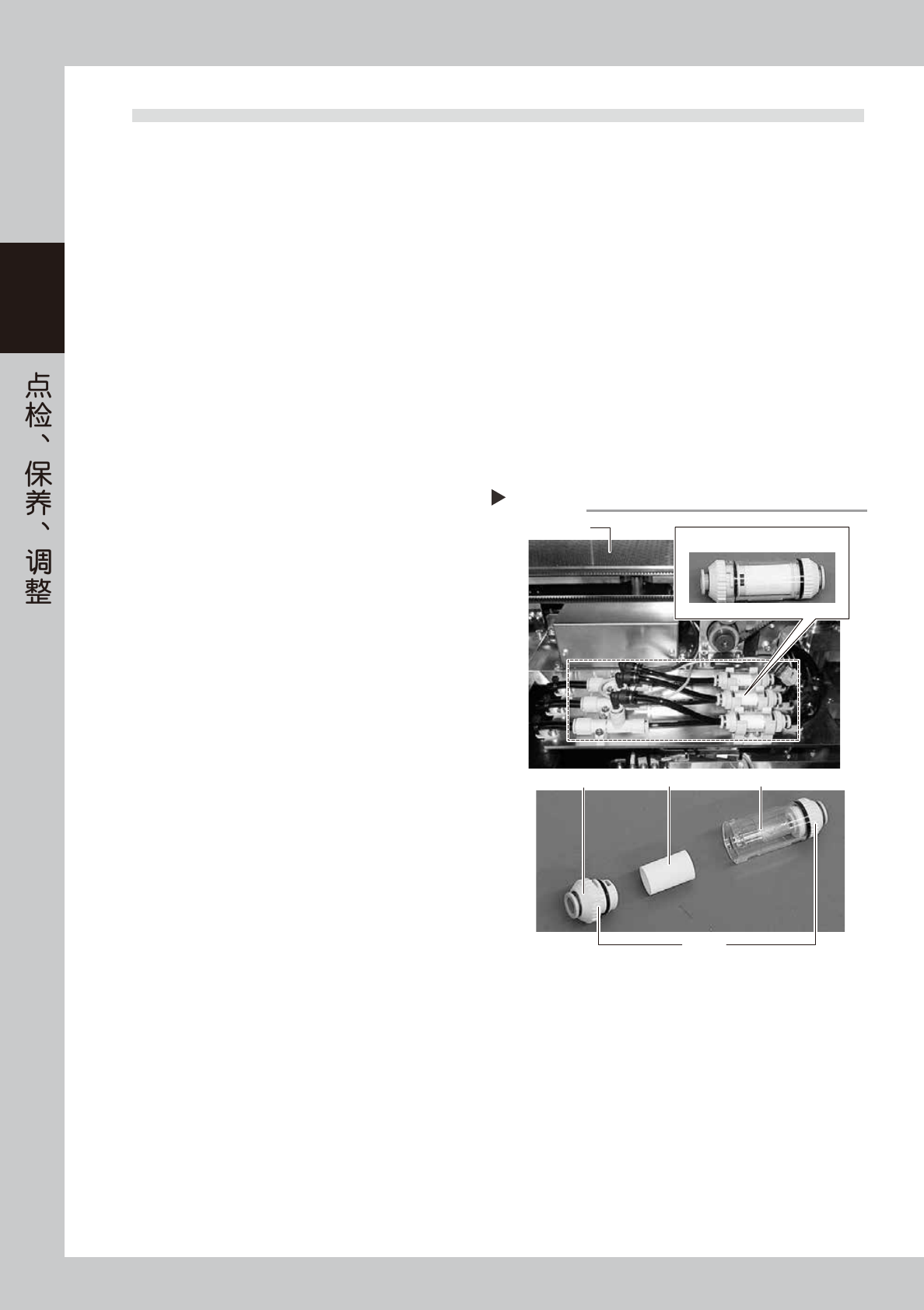 2-20 2 3.4 网板吸附用滤芯的清洁与更换 下面,介绍网板吸附用滤芯的清洁与更换方法。 ■需准备的用品 ‧ 十字螺丝刀 ‧ 更换用滤芯 (KGR-M9934-F0XFILTER,SPARE) ‧ 喷气工具 ( 选购件 ) 1 返回原点。 确认安全之后, 按生产设计画面的 [ 返回原点 ] 按钮。 印刷工作台移到里侧。 e 2 按急停按钮。 为保障作业安全, 务必将印刷机置于紧急停机状态。 3 拆卸背面机门。 用…