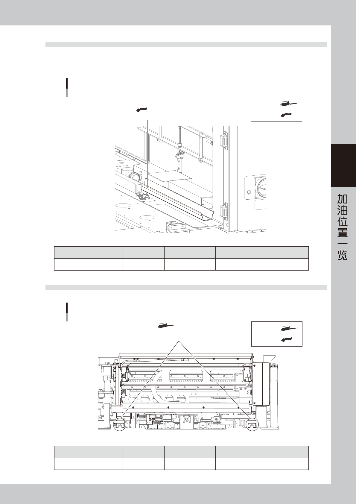 3-9 3 2.5 吸入式鼓风机部 2.5.1 鼓风软管导槽 吸入式鼓风机部的加油位置 鼓风软管导槽 润滑油枪 : 用手涂抹 : 55310-N1-00 加油部位 加油位置 频率 加油方法 鼓风软管导槽 1 更换鼓风软管时 用手涂抹 2.6 清洁装置部 清洁装置的加油位置 Y方向导轨部 润滑油注油嘴 润滑油枪 : 用手涂抹 : 55311-N1-00 加油部位 加油位置 频率 加油方法 Y 方向导轨 2 每月 润滑油枪