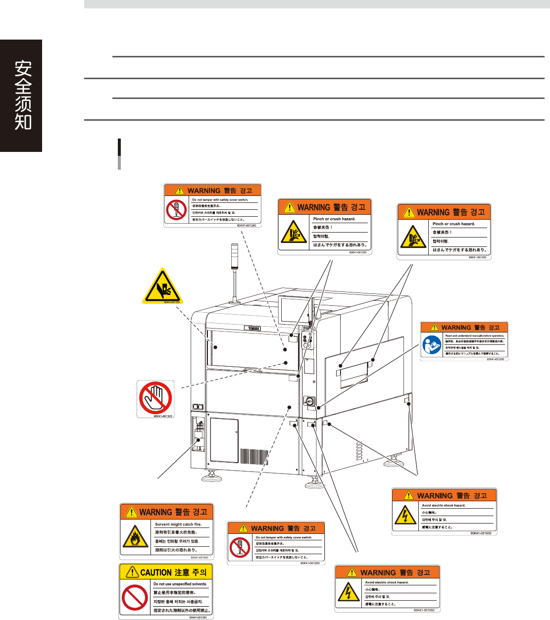 为了安全使用机器,如下图所示,在设备各个部位张贴了警告标贴,务必严格遵守标贴指示。此外,关于本节所