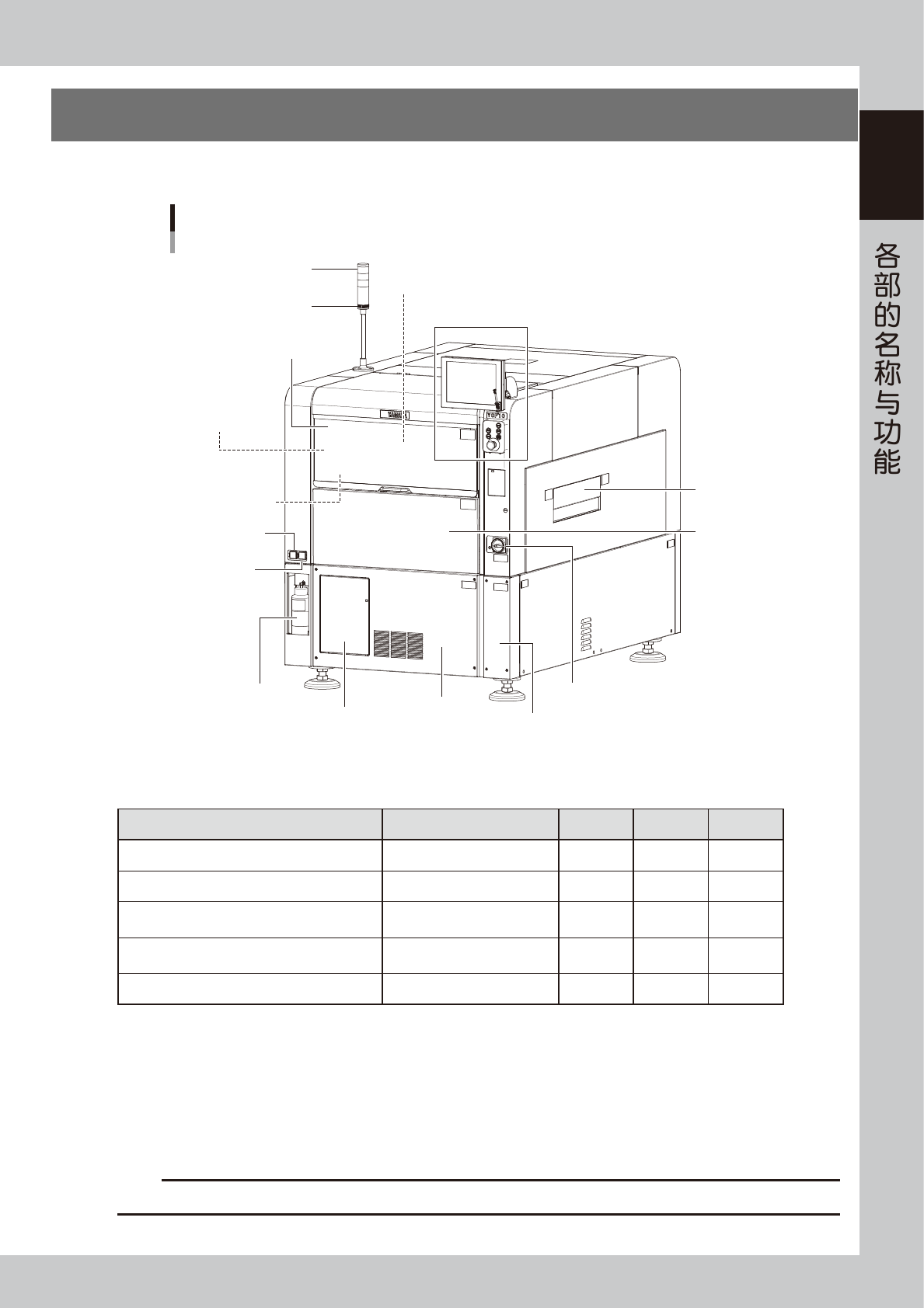1-2 1 ■ 侧夹板用气压表、气压调节器 ( 印刷机内左侧 ) 显示、调节驱动侧夹板的气压。详细内容,请参阅附录“1.1.2侧夹板用气压调节部” 。 ■ 安全闸门 ( 防止手误入 ) 为防止运行过程中手误入可动部而设计的闸门,同时还可以有效防止基板被误传入。 ■ 传送装置 传送装置安装在印刷工作台的下方。详细内容,请参阅本章“4.传送装置” 。 ■ 印刷部 印刷部由刮刀头和印刷工作台组成。详细内容,请参阅本章“3.印刷部” 。 …