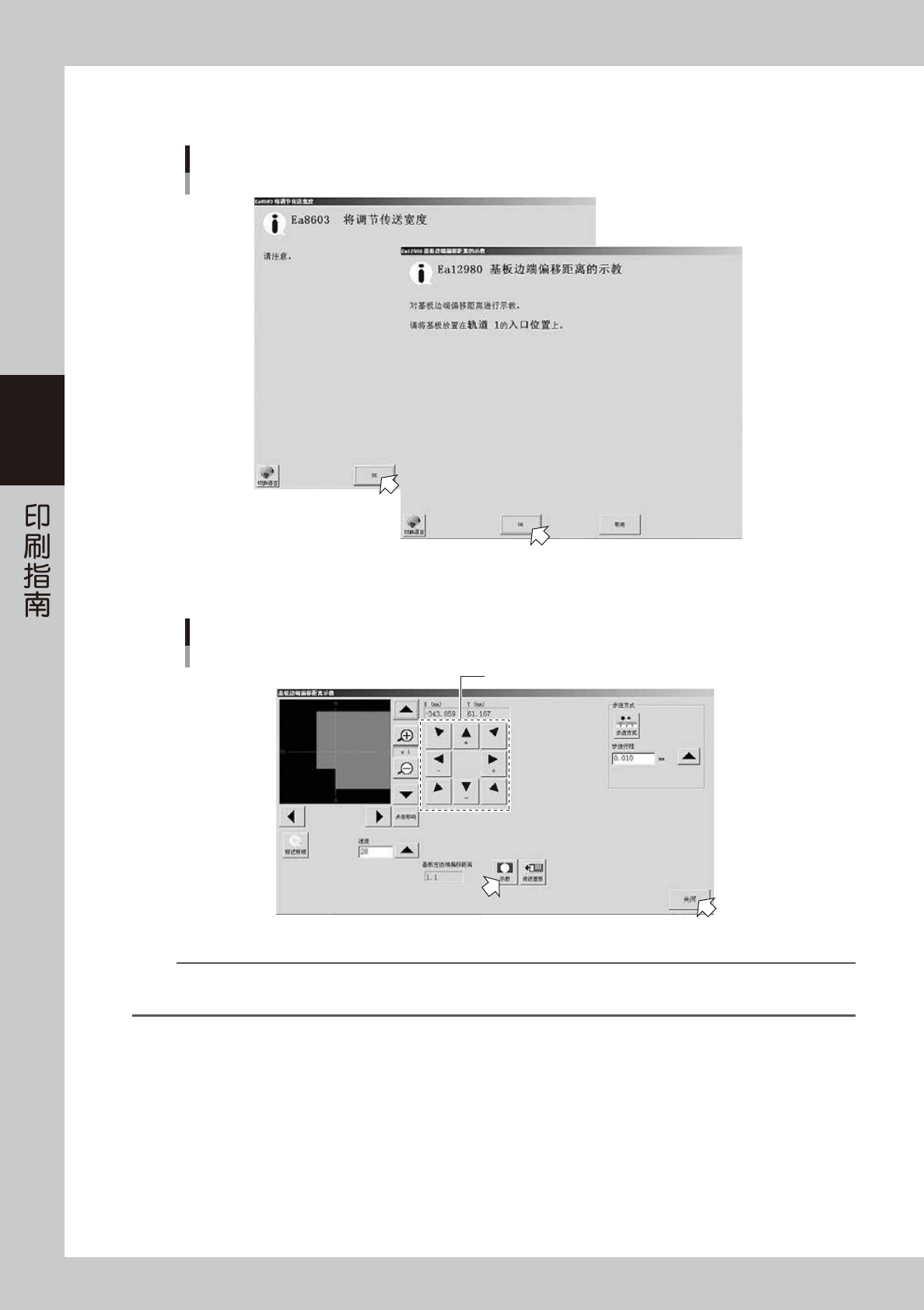 3-1 1 3 5. 按 [ 关闭 ] 按钮,关闭示教画面。 “v.基板边端偏移距离左下”或“w.基板边端偏移距离右下”参数中自动输入示教得到的偏移距离。 示教结束后 以“基板边端偏移距离 左下”为例 自动输入偏移距离值 66310-N1-00 3.2.3 传送电机 ( 传送基板 ) 的速度 ■ 作用 调节传送电机的速度,即传送基板的速度。 ■ 设置方法 设置 [ 印刷 ]-“基板”选项卡的“o.传送电机的速度”参数。…