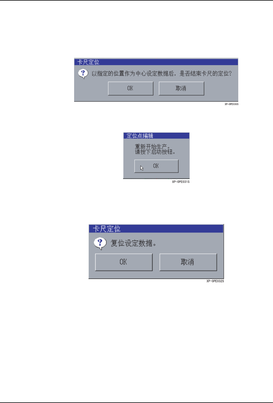 3. 操作系统 SYS-XP243-1.0S 100 XP-242E/243E 系统手册 各个按键的说明 (1) [ 中心坐标设定 ] 按键 在定位点的编辑画面上按下 [ 中心坐标设定 ] 按键后显示出以下的对话框。按下 [OK] 键后 设定定位点位置并结束定位点编 辑。 按下 [ 取消 ] 键, 不设定数据而返回定 位点编辑画面。 设定数据后显示出以下的对话框 。按下 [OK] 键,转入自动运转的画面。按下机器的 [ 启动 ] 按钮,…