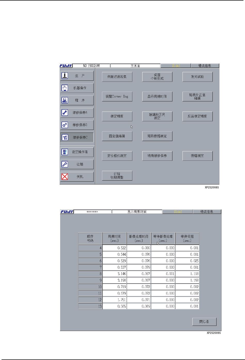 1. 在 [ 主画面 ] 上选择 [ 维修保养 C]、[ 周期时间显示 ],显示出 [ 周期时间显示 ] 画面。