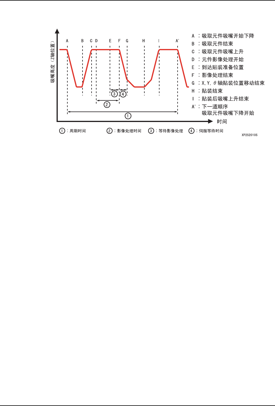 间作为周期时间。将贴装后从吸嘴上升结束 (I) 开始到下一个顺序的元件吸取吸嘴开始下降