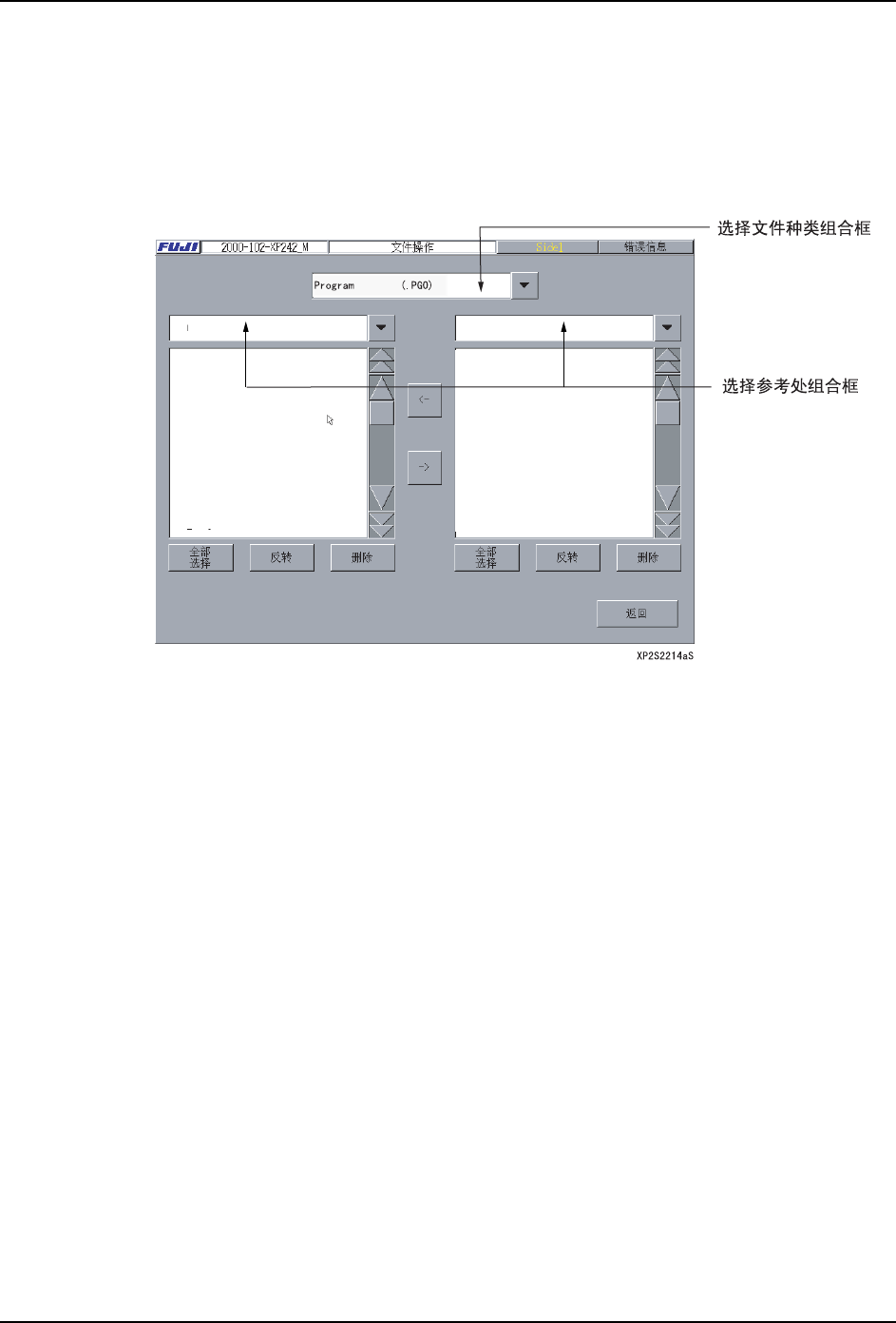 3. 操作系统 SYS-XP243-1.0S 132 XP-242E/243E 系统手册 3.7.3 文件操作 文件操作是在把机器上创建的生 产程序和元件数据文件复制到软盘 中或删除无用文件时使 用。此外,也可在软盘中保存、 将复制的文件复制到机器中。 选择 [ 程序 ]、[ 文件操作 ] 后,显示出以下的 画面。 注意 ) 如果以相同的文件名复制时,则会以改写形式保存。请确认文件名后再复制。 选择文件种类的组合框 在这个框中,请选择目…