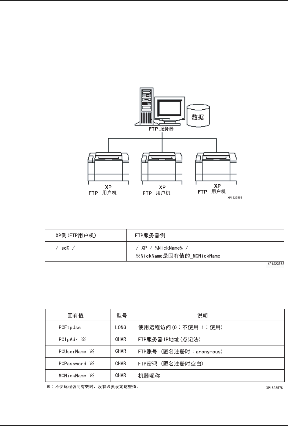 3. 操作系统 SYS-XP243-1.0S 140 XP-242E/243E 系统手册 3.7.4 数据库的远程访问 要将在机器上创建的元件数据在 所有的 XP 机器上共用时使用。将在机器上创 建的元件数据 库文件保存到 FTP 中,由远程访问进行文件的输入输出。 访问外部的 FTP 服务器时的接口号码是 21( 固定 )。 在服务器一侧,请在位于主文件 夹下必须准备 「XP」的文件夹。 备注 ) 要在所有的机器上共用文件时,请用相同…