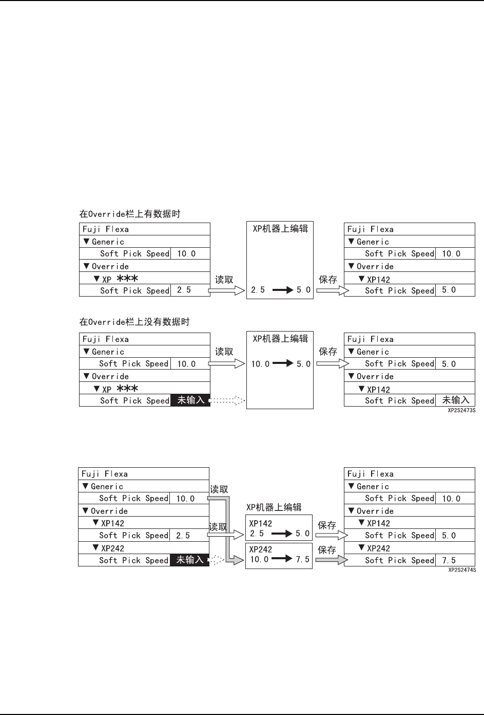 SYS-XP243-1.0S 3. 操作系统 XP-242E/243E 系统手册 151 生产程序的编辑 在 XP 机器 上编辑 Fuji Flexa 的 Job 时, 为 了保持 Job 的 整体性, 与旧机型 上编辑不同, 有 其他的限制或者注意事项。 顺序数据 在 XP 机器 上编辑顺序数据, 保存到 Fuji Flex a 的 Job 中时, 对于端口号 与参考一致的顺序 数据反映编辑结果。 参考与端口号一 致的顺序不存在于 F…