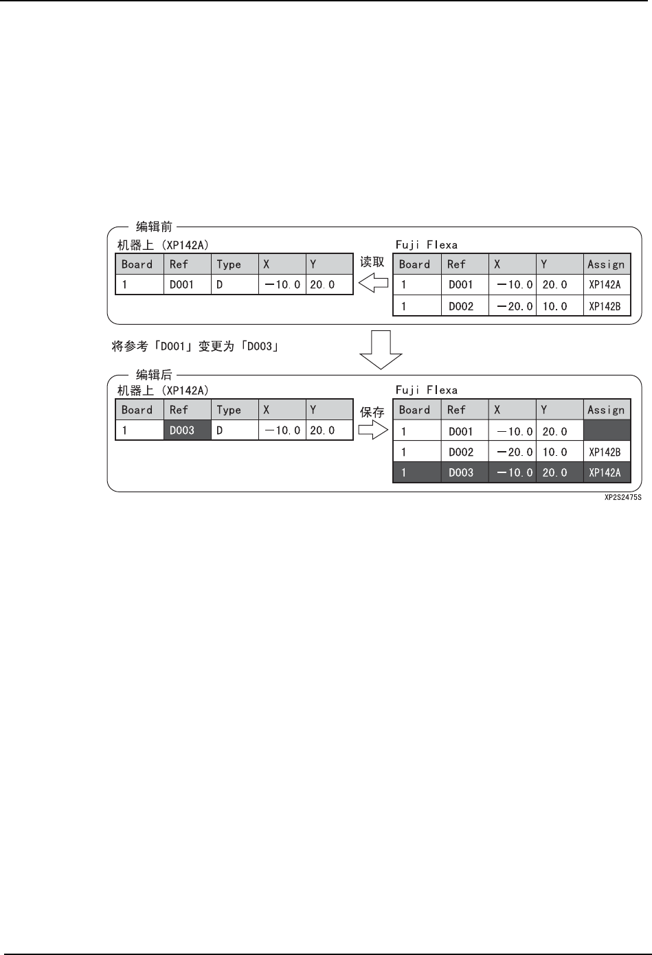 用上面的例子进行说明。将在 XP 机器上的顺序的参考从 「D001」变更到 「D003」后,在