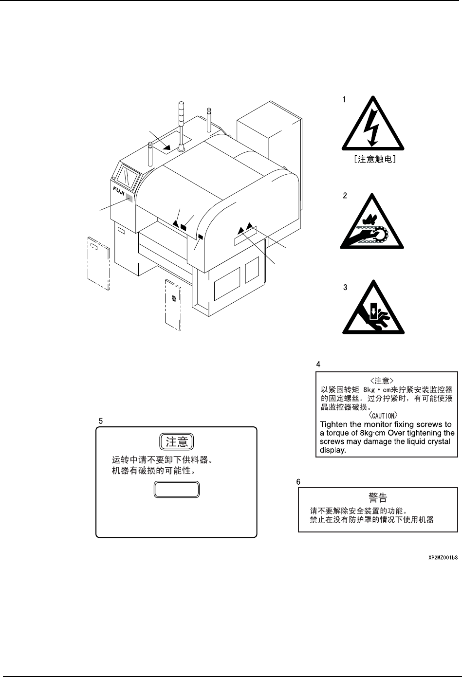 表示使用机器时的注意事项的标示牌贴在本机器的如下图所示的位置,请仔细阅读,确保安