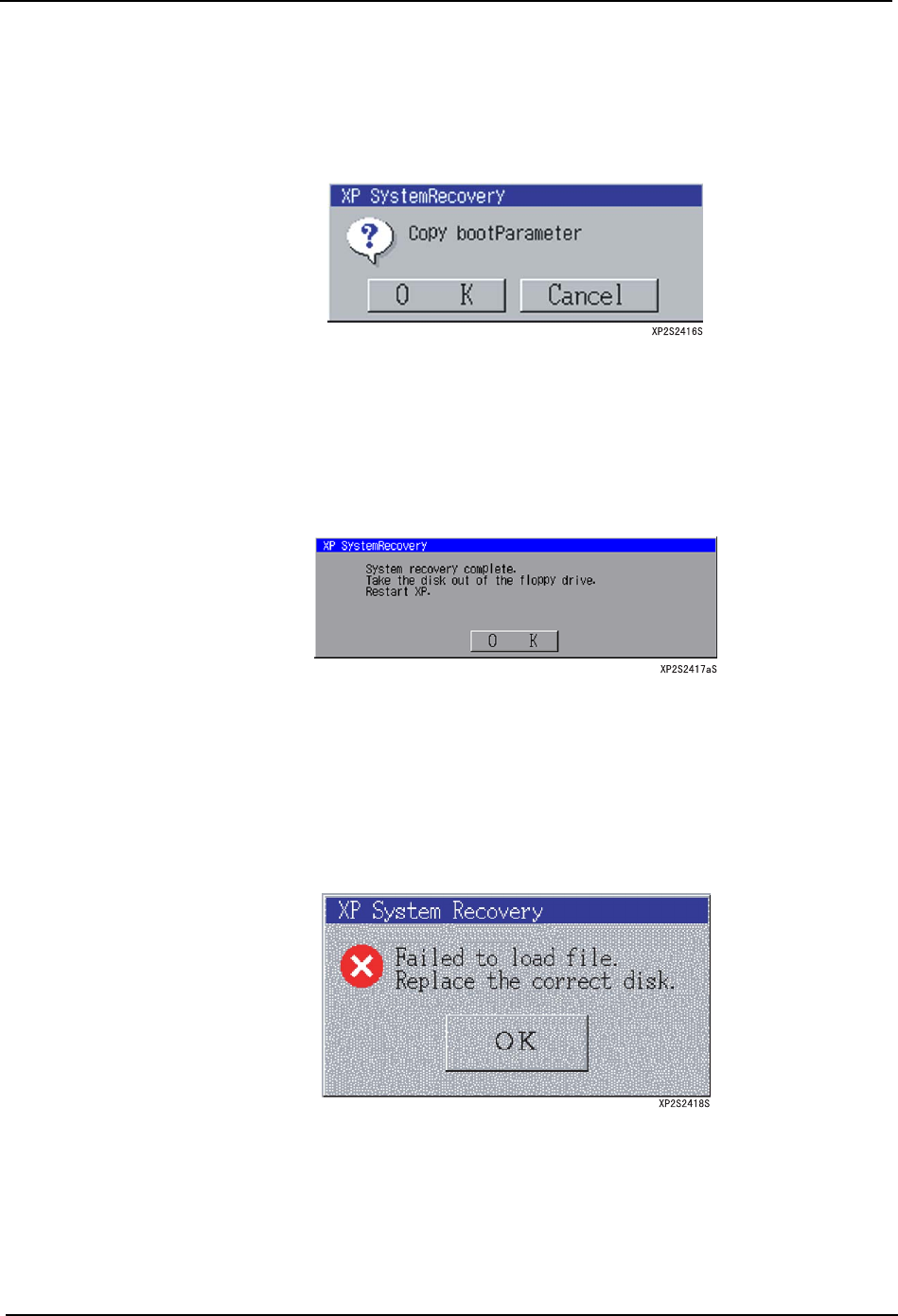 3. 操作系统 SYS-XP243-1.0S 168 XP-242E/243E 系统手册 系统数据的恢复 在 XP 机器上备份数据时,可以将设定恢 复到取得备份时的状态。在解冻前项 的文件后,显 示执行恢复系统数据用的对话框 。 操作步骤 1. 将 「系统数据备份盘」 插入软驱中, 单击 [OK] 键后, 对备份的数据进行复制。 没有备份 数据时, 单击 [ 取消 ] 键, 跳过这个处理。 在软驱内未插入正确盘的状态下单 击 [OK] …