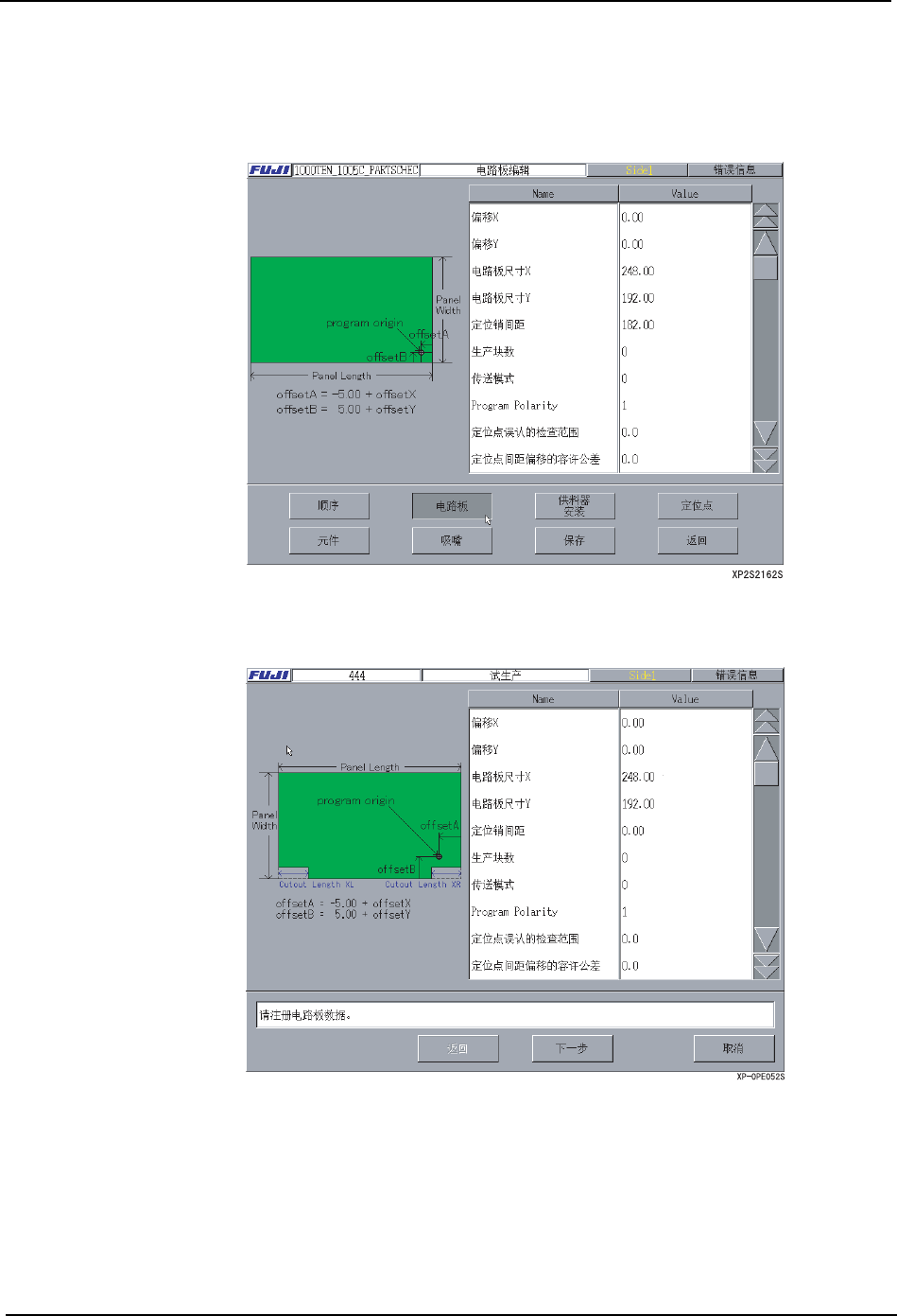 4. 机器生产程序 SYS-XP243-1.0S 210 XP-242E/243E 系统手册 修正量 Y 以顺序输入的坐标的基准点与 FUJI 的程序坐标原点 ( 从电路板右下角开始在 X 方向为 -5mm、 Y 方向为 +5mm 的坐标 ) 不同时, 有必要输入修正值。 请输入从电路板上 FUJI 的原点到输入 坐标数据的基准点的 Y 方向的修正值。(-600.00mm ~ 600.00mm) 电路板 X 设定电路板的 X 方向尺寸。…
