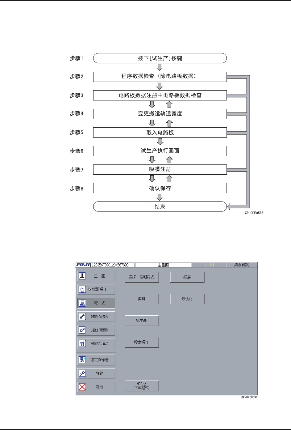 4. 机器生产程序 SYS-XP243-1.0S 252 XP-242E/243E 系统手册 4.3.8 试生产 一边进行试贴装或者模拟,一边 可以进行程序的创建 / 编辑 / 确认。 此功能称作为试生产。 步骤 1 试生产的执行 确认修正已有的程序时,预先从 [选择编辑程序]画面下 载相应的程序。 请在 [主画面]上选择 [ 程序 ] 后按下 [ 试行 ] 按键。
