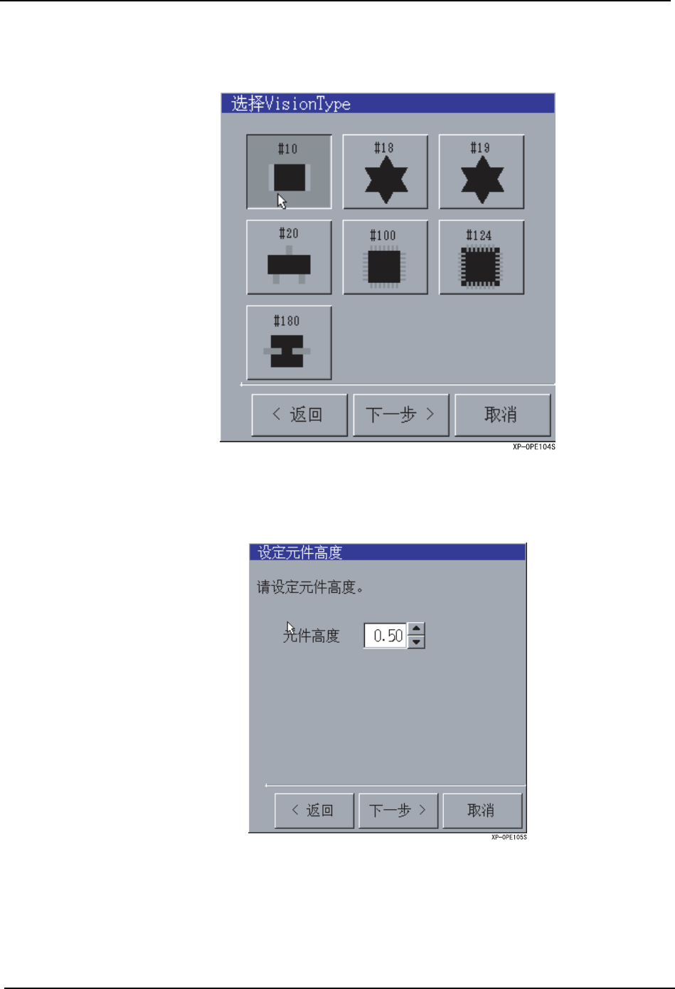 SYS-XP243-1.0S 5.MDW/PDW XP-242E/243E 系统手册 295 9. 显示 [ 选 择 Visio n Type] 对话框。 请选择编辑的 Vision Ty pe,按下 [ 下 一步 ] 按键。 10.显示 [ 设定元件高度 ] 对话框。 请设定元件高度,按下 [ 下一步 ] 按键。 (设定范围:0.0 1 ~ 6.00mm)