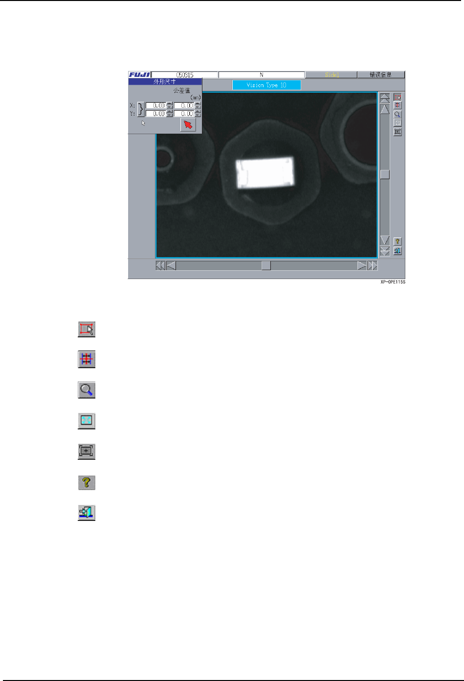 5.MDW/PDW SYS-XP243-1.0S 304 XP-242E/243E 系统手册 操作步骤 1. 按下下图,变成外型尺寸的输入模式。 在 [ 外型尺寸 ] 对话框和画面上显示出属性。 2. 外型尺寸知道 时,输入外型尺寸的 X、Y 数值。 ( 0.00 ~ 150.00 mm) 直接输入时,按下 [ 红箭头 ] 按键后用鼠标请将元件影像斜方向脱动。要 素被更新后显 示在 [ 外形尺寸 ] 对话框上。 3. 按下下图后,进行影…