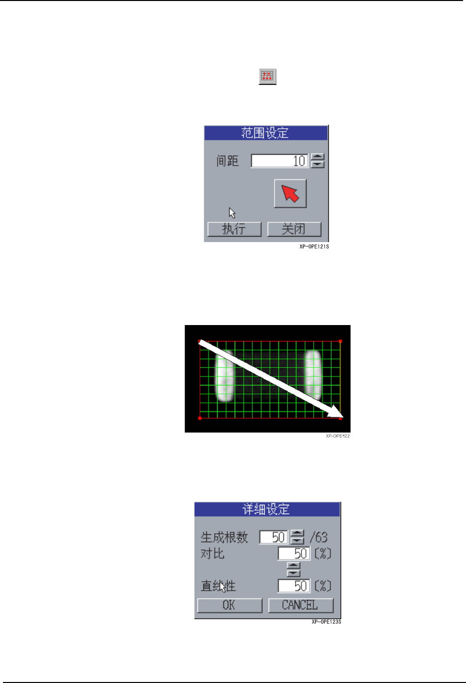 5.MDW/PDW SYS-XP243-1.0S 308 XP-242E/243E 系统手册 [Line Param eter] 对话框项目说明 类型按键: 设定查找线的类 型 ( Pair/Single) 。 角度按键: 使用角度按键,对于轮廓可以设定 垂直相交的查找线。 角度自动生成即 使用类型按键选 择 [Pair] 也只能生 成 Single 查找线。 角度编辑框: 可以从 -360 到 +360 输入查找线的角度。单位是 (度…