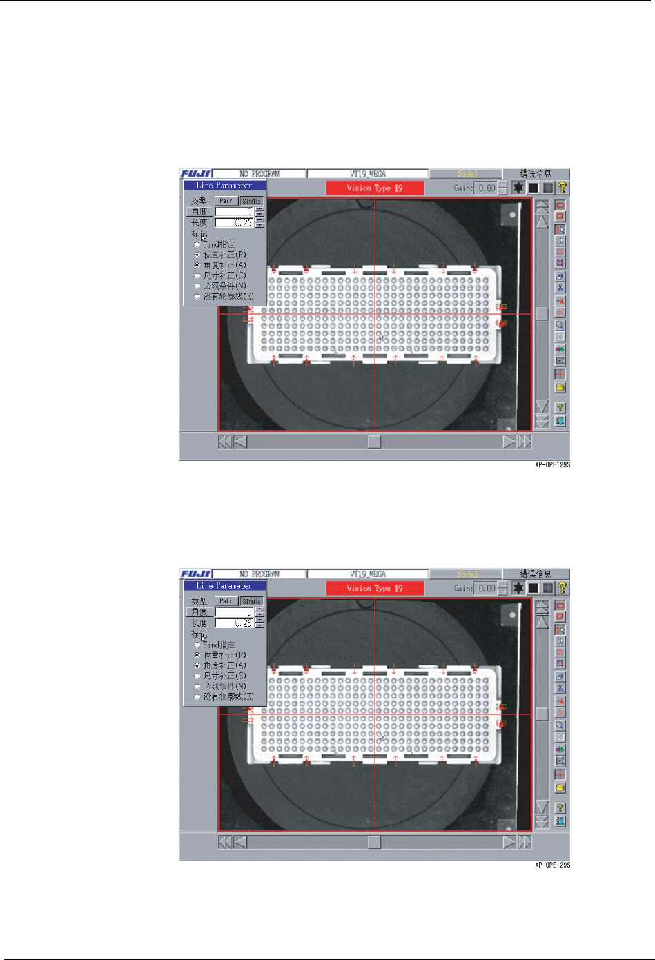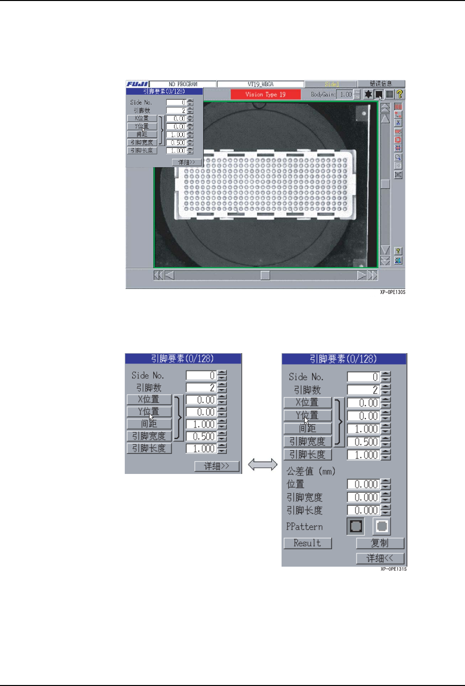 SYS-XP243-1.0S 5.MDW/PDW XP-242E/243E 系统手册 313 5.4.4 用 Vision Type19 编辑 Vision Type19 可以将进行影像处理的模板从 「查找线」 、 「引脚要素」 、 「锡球要素」 中选 择。 备注 ) 锡球要素的编辑只有在要素处于元件主体内侧时可以编辑。 各个要素的编辑通过选择在编辑 画面右上的模式按键进行。 查找线编辑模式 查找线的编辑操 作与 Vision Type…