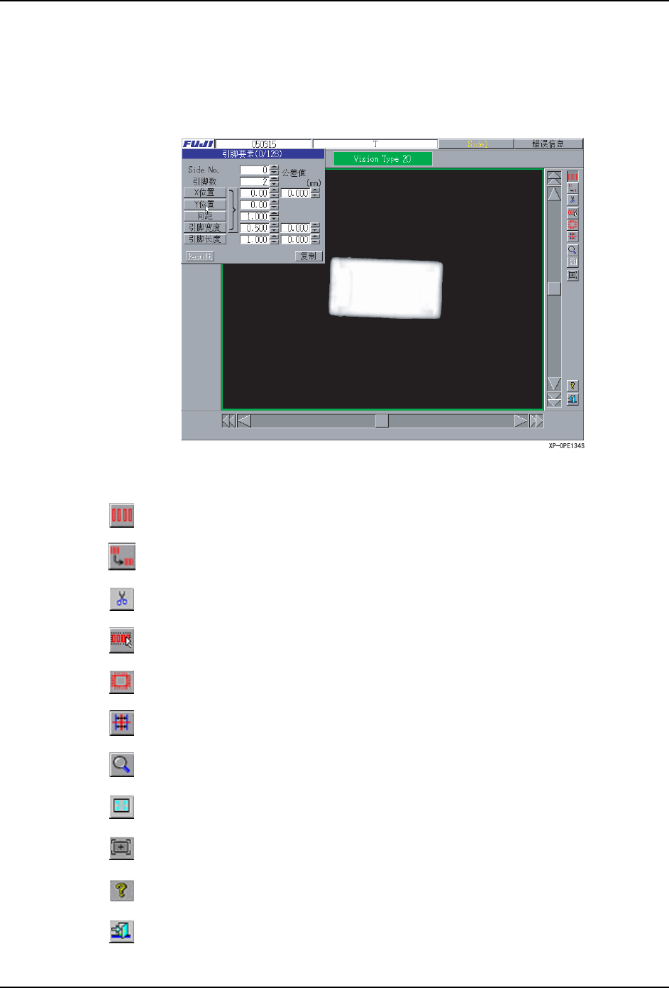 5.MDW/PDW SYS-XP243-1.0S 316 XP-242E/243E 系统手册 5.4.5 用 Vision Type20 编辑 Vision Type20 可以进行引 脚要素的设定、生 成。 编辑的单位以称作为要素的引脚 群组单位进行, 要素有必要在 2 个(引脚有 1 根也可以) 以 上。 按键说明 是引脚要素输入模式。 复制选择的引脚要素数据。 全部删除选择的要素数据。 是引脚要素自动输入模式。 是引脚要素全自动输入…
