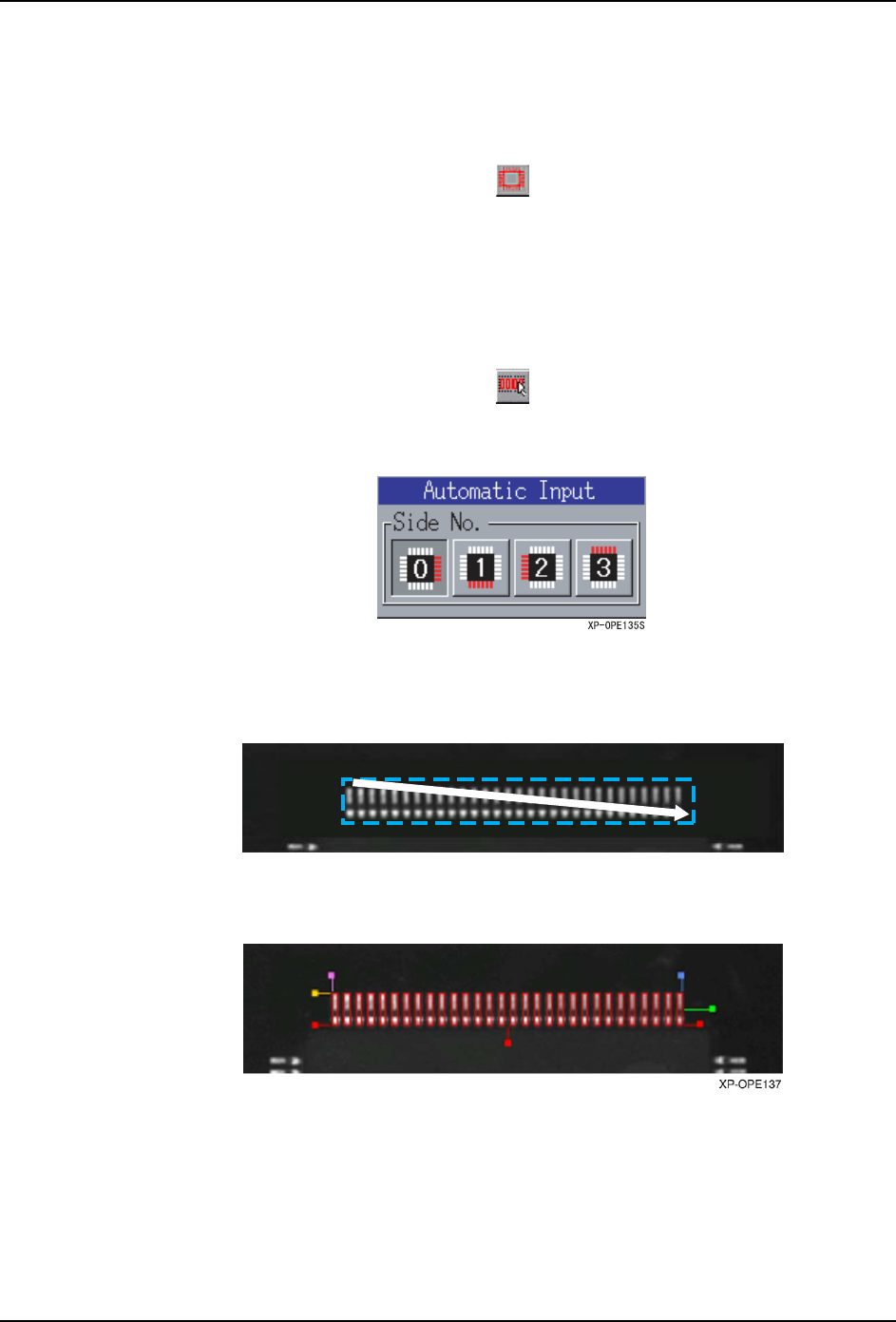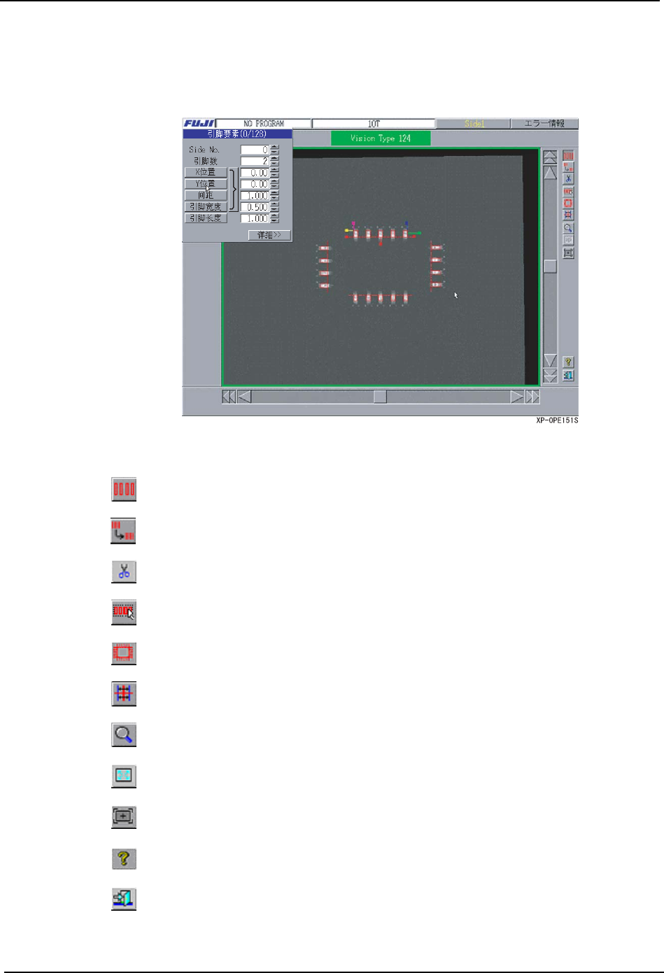 SYS-XP243-1.0S 5.MDW/PDW XP-242E/243E 系统手册 329 5.4.7 用 Vision Type124 编辑 Vision Type124 可以进行引脚要素的设定、生成。 编辑的单位以称作为要素的引脚 群组单位进行, 要素必须有 2 个 (引脚有 1 根也可以) 以上。 按键说明 是引脚要素输入模式。 复制选择的引脚要素数据。 全部删除选择的要素数据。 是引脚要素自动输入模式。 是引脚要素全自动输入模…